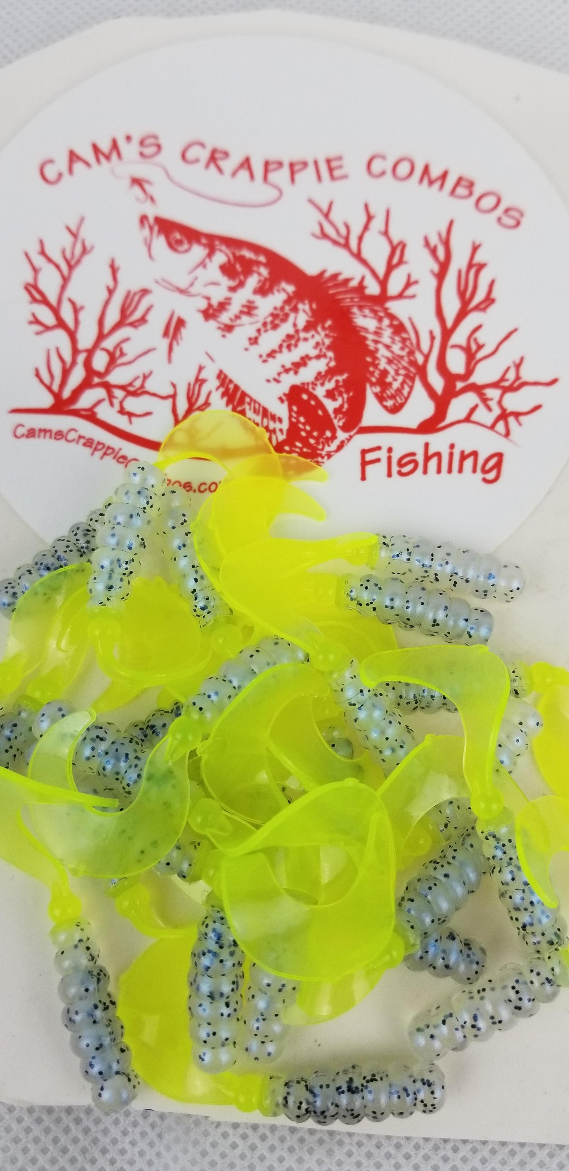 Cam's 2"(HOLOGRAM FLAKE) CURLY TAIL 100pc MONKEY MILK & CHARTREUSE Crappie Soft Jigs [A Cam's Exclusive]