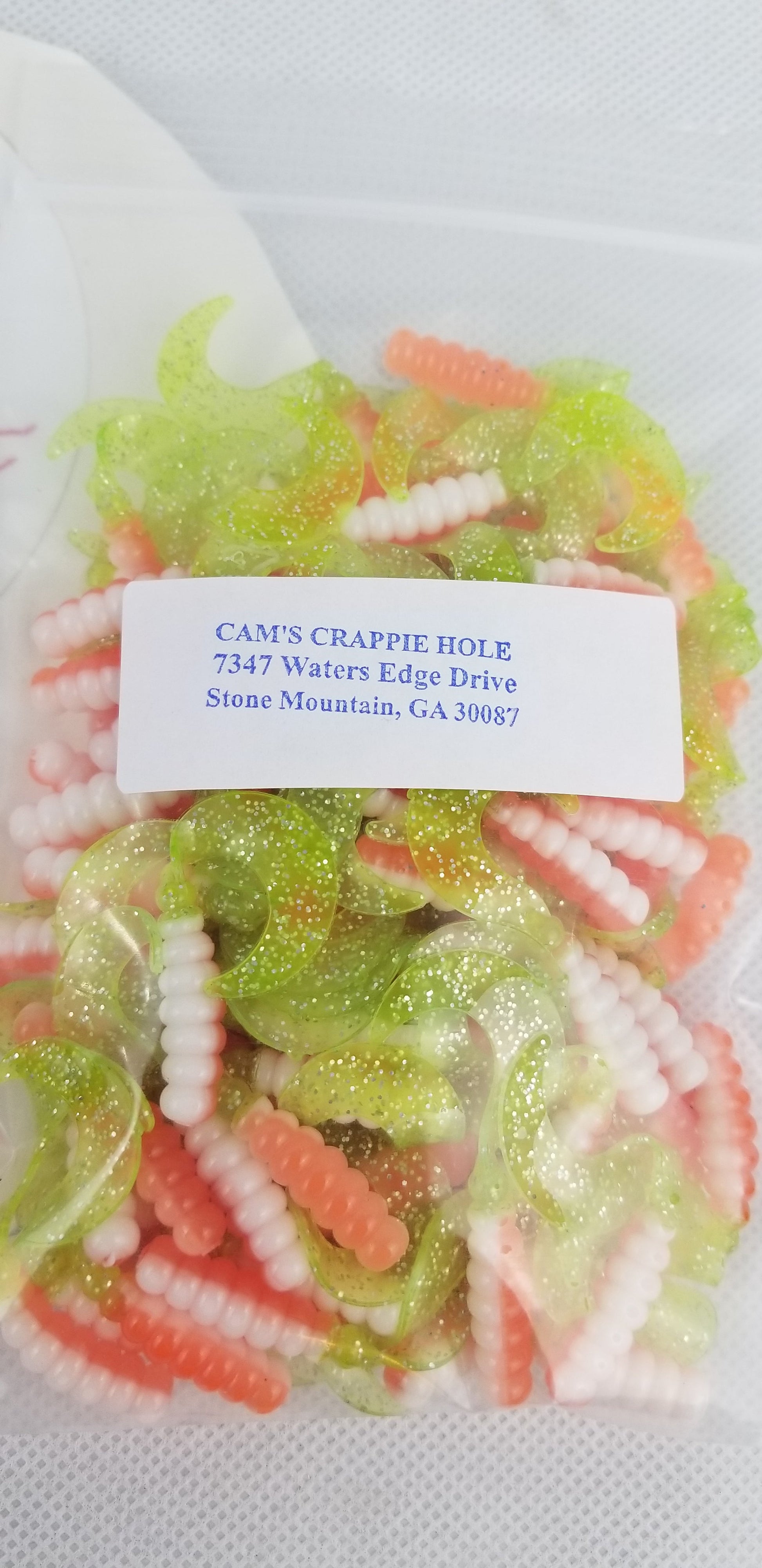 CAM's (HOLOGRAM FLAKE) 2" CURLY TAIL HAND POURED AND MADE OF HIGH QUALITY SOFT MATERIAL.... THESE ARE A MUST FOR CRAPPIE FISHERMAN... YOU PUT THESE IN THE WATER AND THERE IS NO WAY TO KEEP THEM FROM WIGGLING Soft plump body section with a single pointed tail is a near perfect imitation of a baby shad...Its dancing Perpetual motion will pull in crappie and panfish quick. ONLY AVAILABLE HERE!