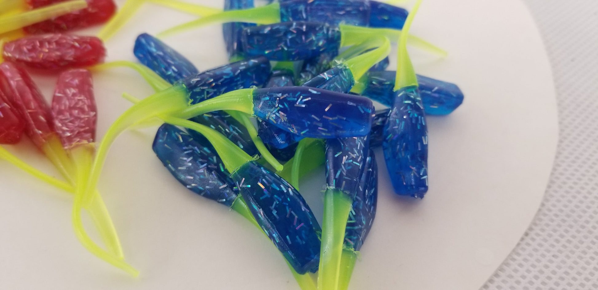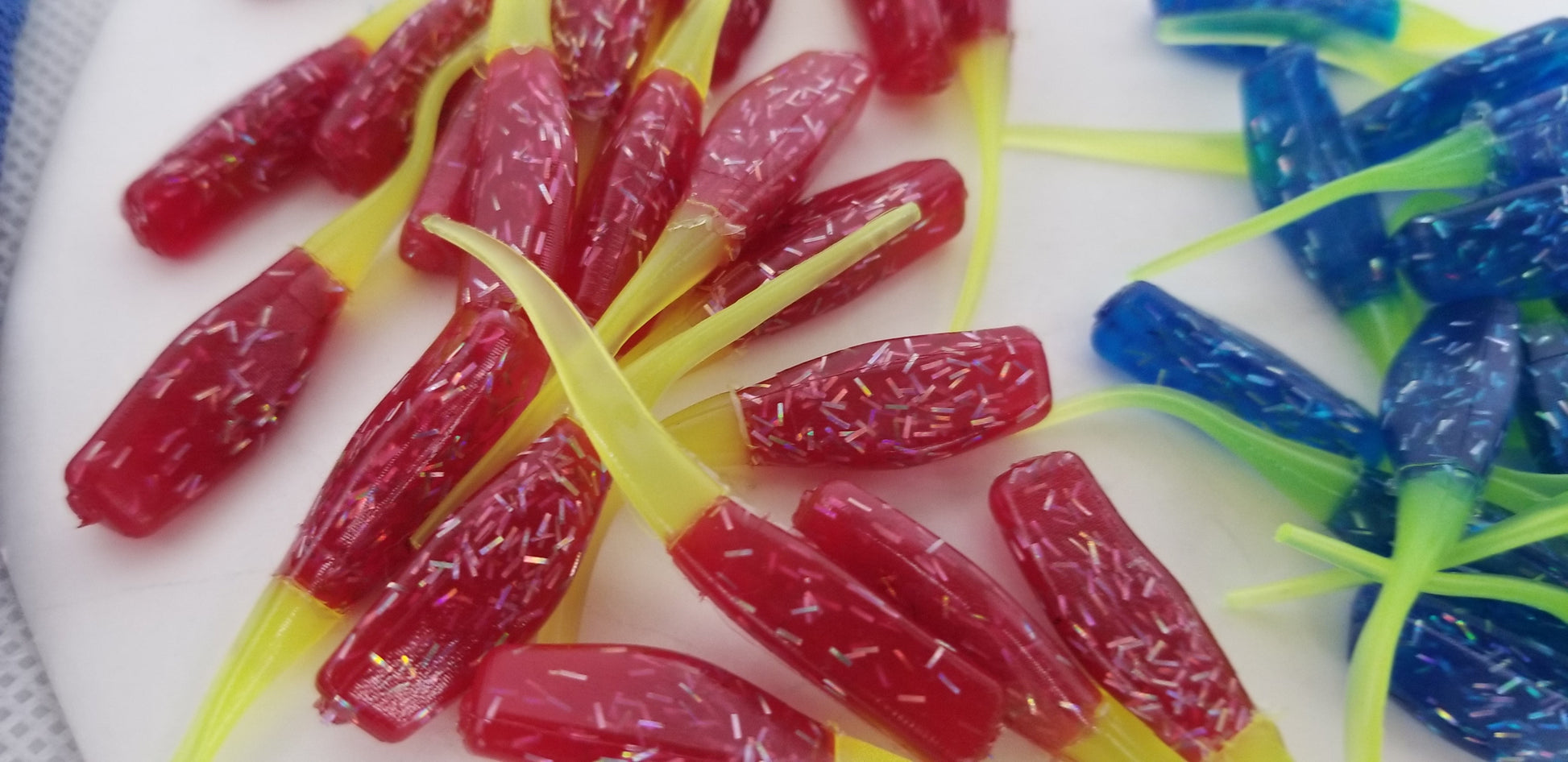 Cam's 2"(HOLOGRAM FLAKE) FIREBALL RED/ FIREBALL BLUE 100pc (SPLIT SET) Stinger Shad Crappie Soft Jigs [A Cam's Exclusive]