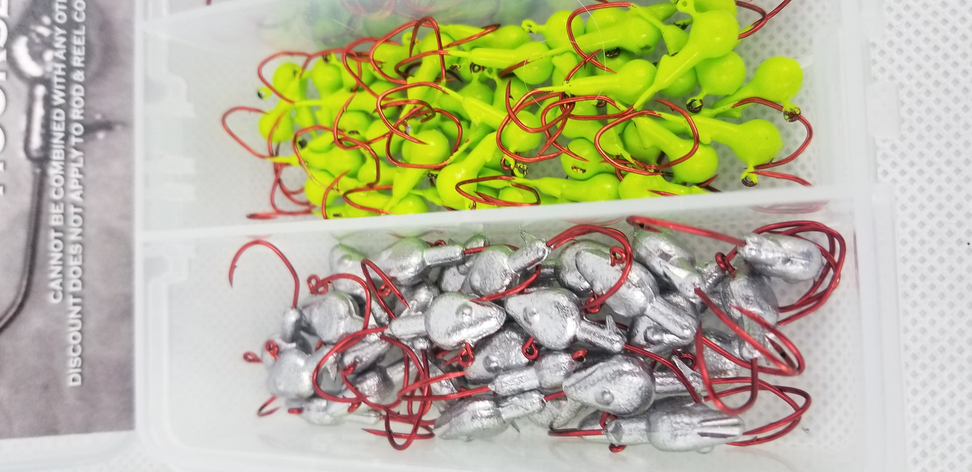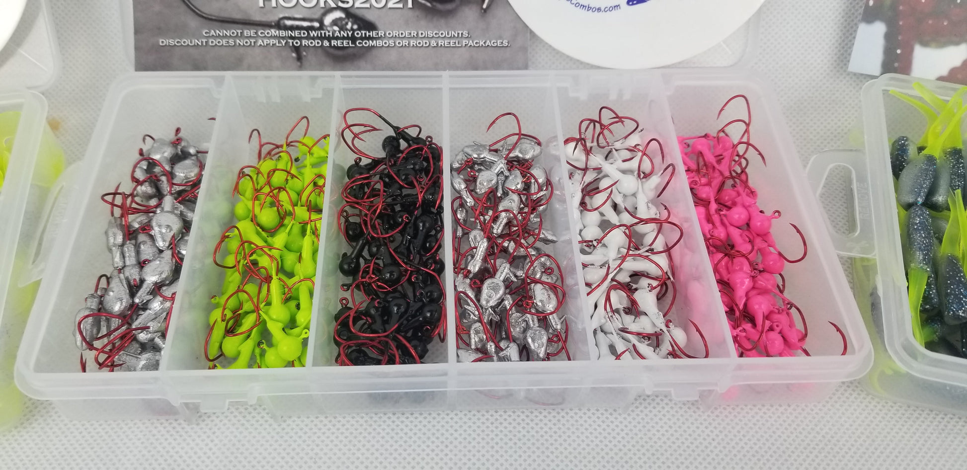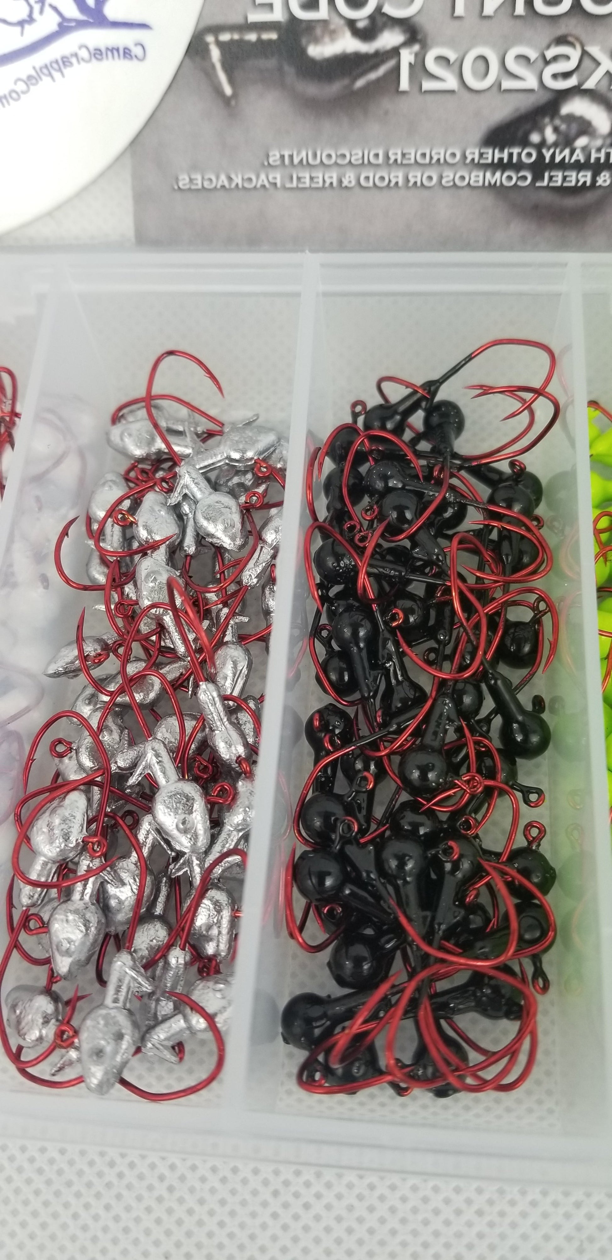 Cam's 90 pc. Hot Pink, Chartreuse, White, Black, and 1/16 - 1/18 non painted minnow Jigheads all #2 deadly blood red hooks. So many of you have asked us to create a "Nasty Bend Hooks" assortment pack with 6 of our most popular colors of hooks. All are made fresh and get their eyes cleaned and I baked each one personally! Also included a Cam's Sticker + complimentary 10% discount coupon on your next purchase. All of this is included in a air tight carrying case ready to be shipped to help you land more crappie. +