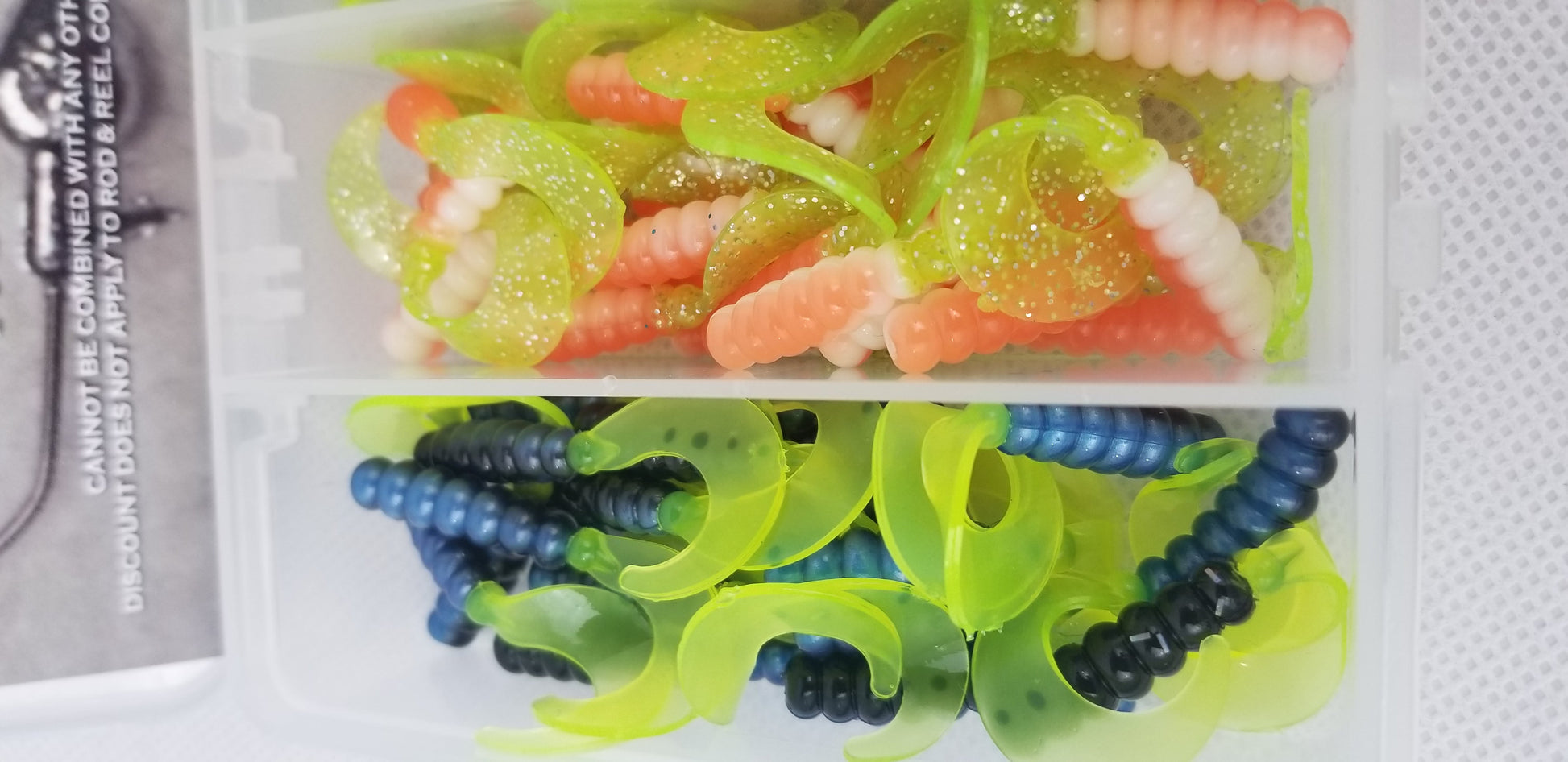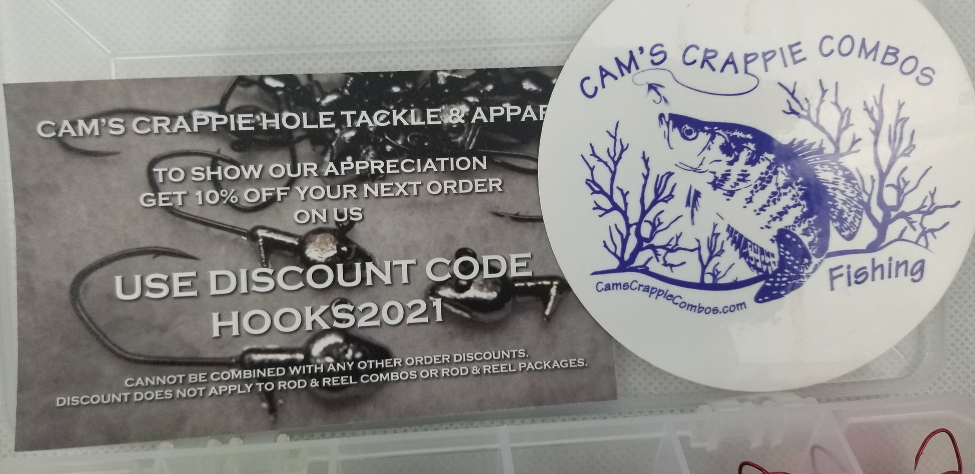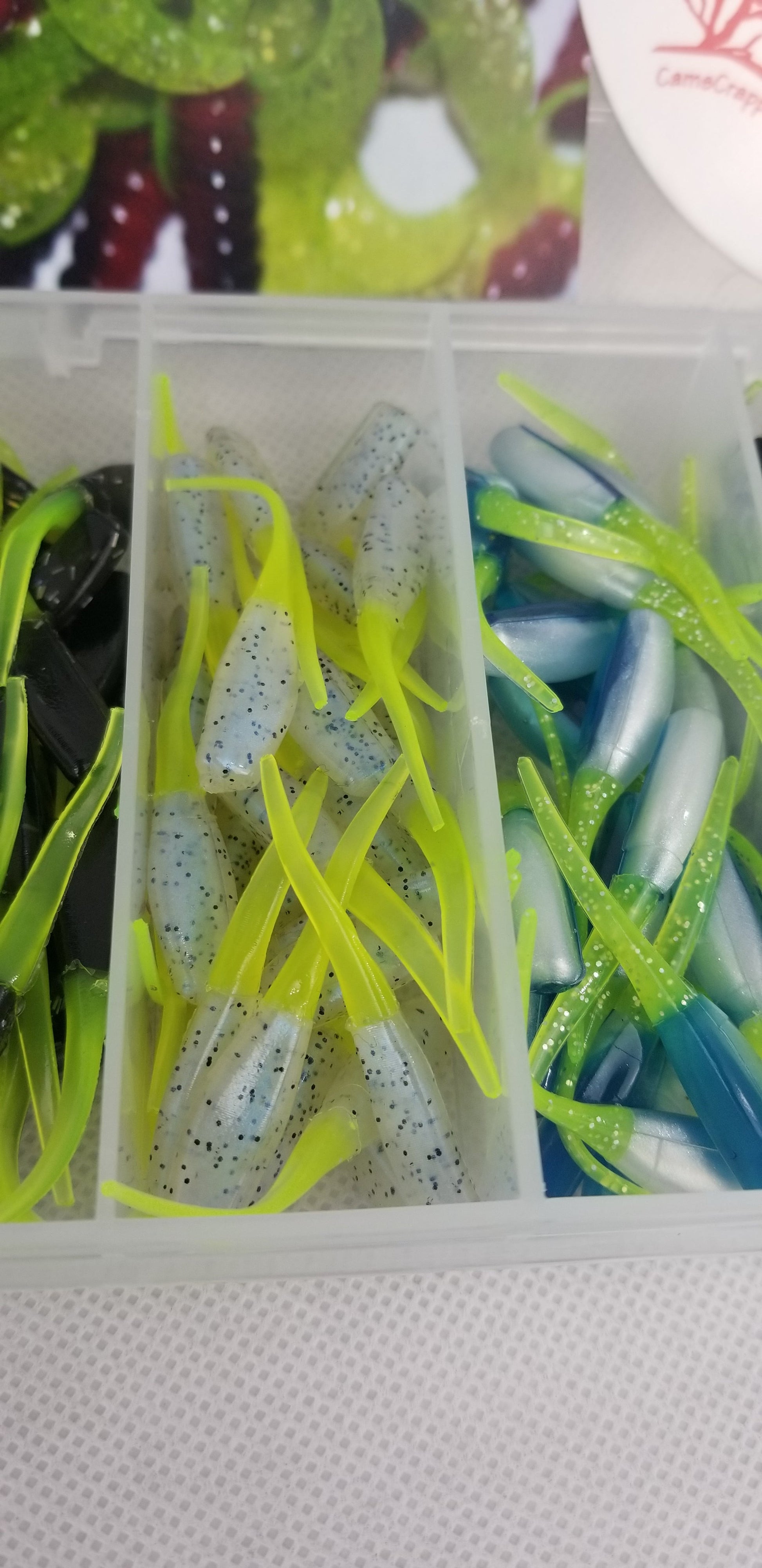 Cam's 3 in 1 Curly Tail & Stinger Shad All Plastics [Hologram Flake] & 90 of Cam's hand painted Assorted Nasty Bend Hooks Jig Heads Kit an exclusive only here at Cam's Crappie Hole. This kit gives you the best of both world's. This combination our finest most popular colors all in 2 separate plano water resistant box. Everything you need in this kit to hit the water with this starter kit. of our most popular proven crappie catching exotic super soft plastic stinger shad and low frequency curly tail grubs. We crated this box for the days that you want to catch and retrieve with the grub or the crappie are holding tight against structure at 8ft. and the day causes for vertical jigging. This box was put together by pro's that know how to catch crappie all around the country. 270 pieces total. All comes in a reusable Plano box with 6 compartment for easy organization, + FREE SHIPPING Plus