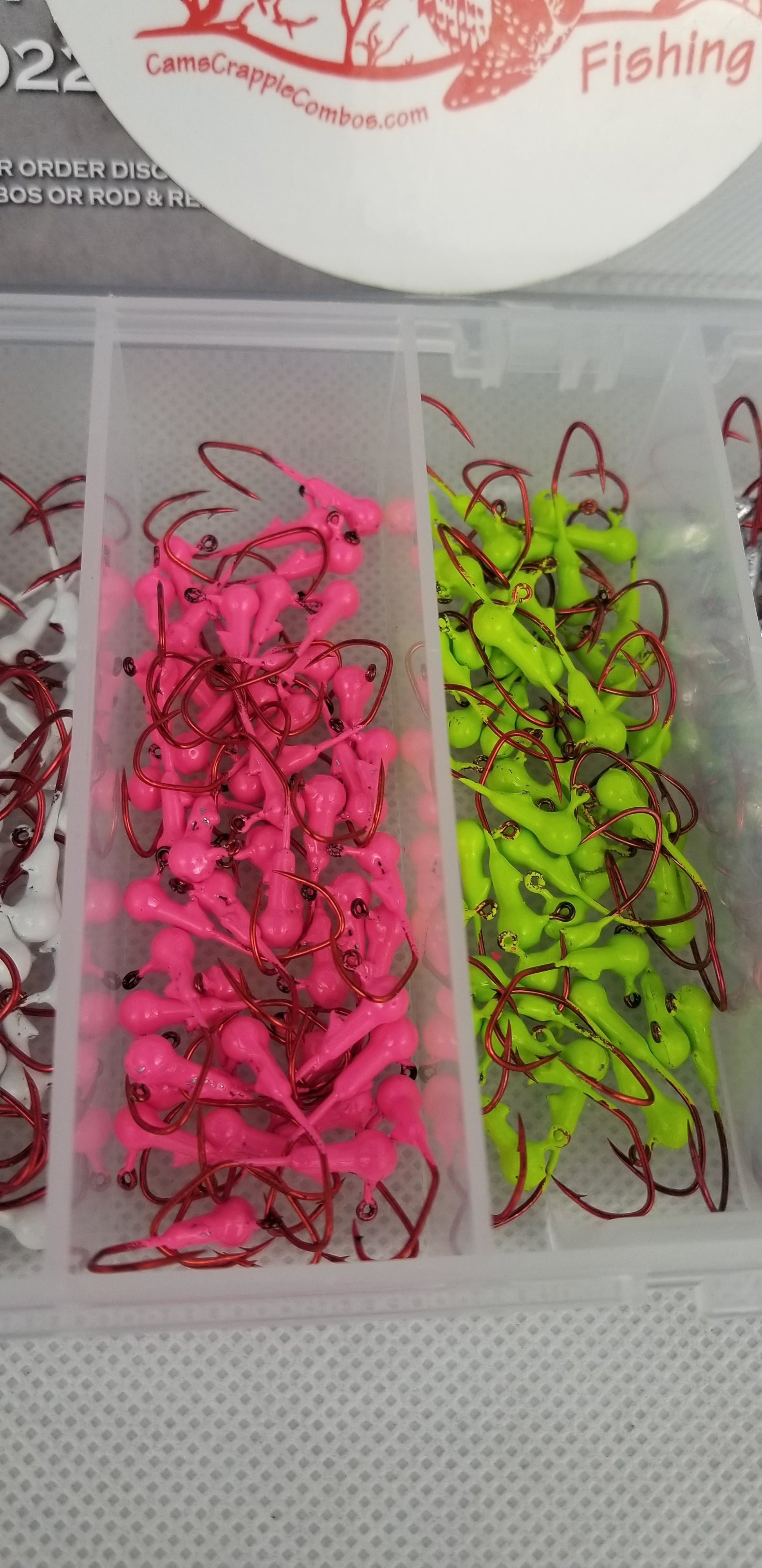 Cam's 60 pc. The Best of The Best Never run out of hooks on the water for you and your friends, All Assorted colors: Hot Pink, Chartreuse, White, Black, and 1/32 - 1/16 non painted minnow Jigheads all #2 deadly blood red hooks. So many of you have asked us to create a "Nasty Bend Hooks" assortment pack with 6 of our most popular colors of hooks. All are made fresh and get their eyes cleaned and I baked each one personally! Also included a Cam's Sticker + complimentary 10% discount coupon on your next purchase. All of this is included in a air tight carrying case ready to be shipped to help you land more crappie. + Free Shipping
