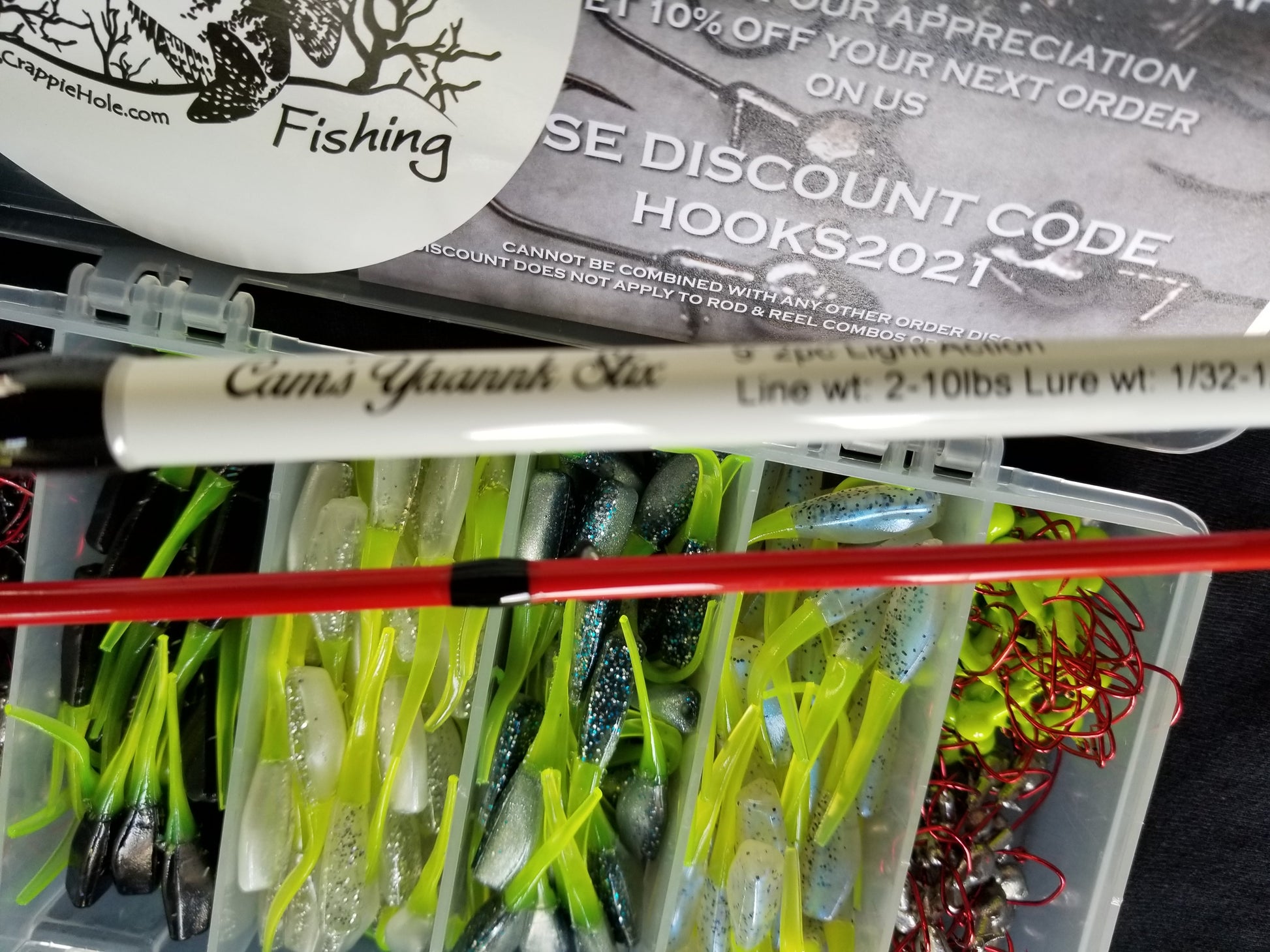 Cam designed this two-piece Yaannk Stiks for being a ultra sensitive and light, rod with premium 2-piece IM-8 White & Blue Caron Fiber blanks. Even the smallest tap is easily felt so you can set the hook. Brass-plated aluminum oxide guides allow smooth line flow. EVA Soft to the touch handle. Use for casting, jigging, trolling, bobber stopping. Handcrafted and specifically made for vertical jigging. Also included are my new 2021 New Cam's Stinger Shad [Hologram Flake] an exclusive only here at Cam's Crappie Hole. This kit is combined with our world Renowned Nasty Bend Hooks. Our Stinger Shad assortment package is the best of both worlds. Everything you need in this kit to hit the water with this starter kit. Included are our Nasty Bend Hooks" 10 ct. 1/16 minnow Head #2 hook + 1/8 minnow Head with #2 Hook, also included are 10ct. Chartreuse 1/16 with #2 red hook and 10ct. Black with #2 red hook + 4 of our most popular proven crappie catching exotic super soft plastic stinger shad 80 pieces total. All comes in a reusable Plano box with 6 compartment for easy organization,