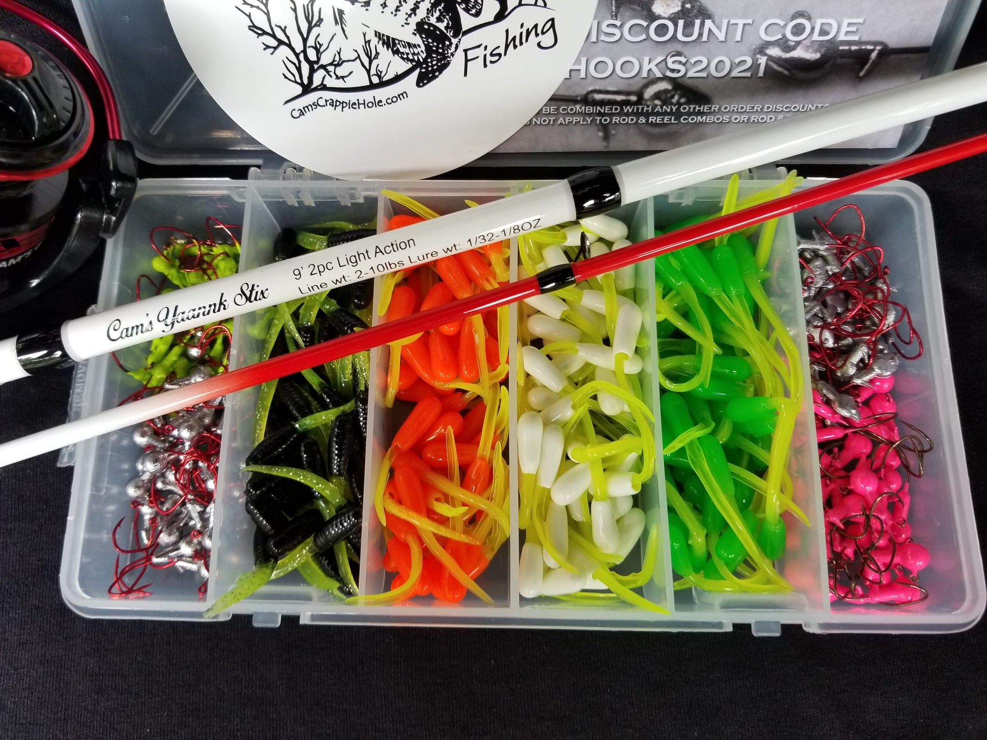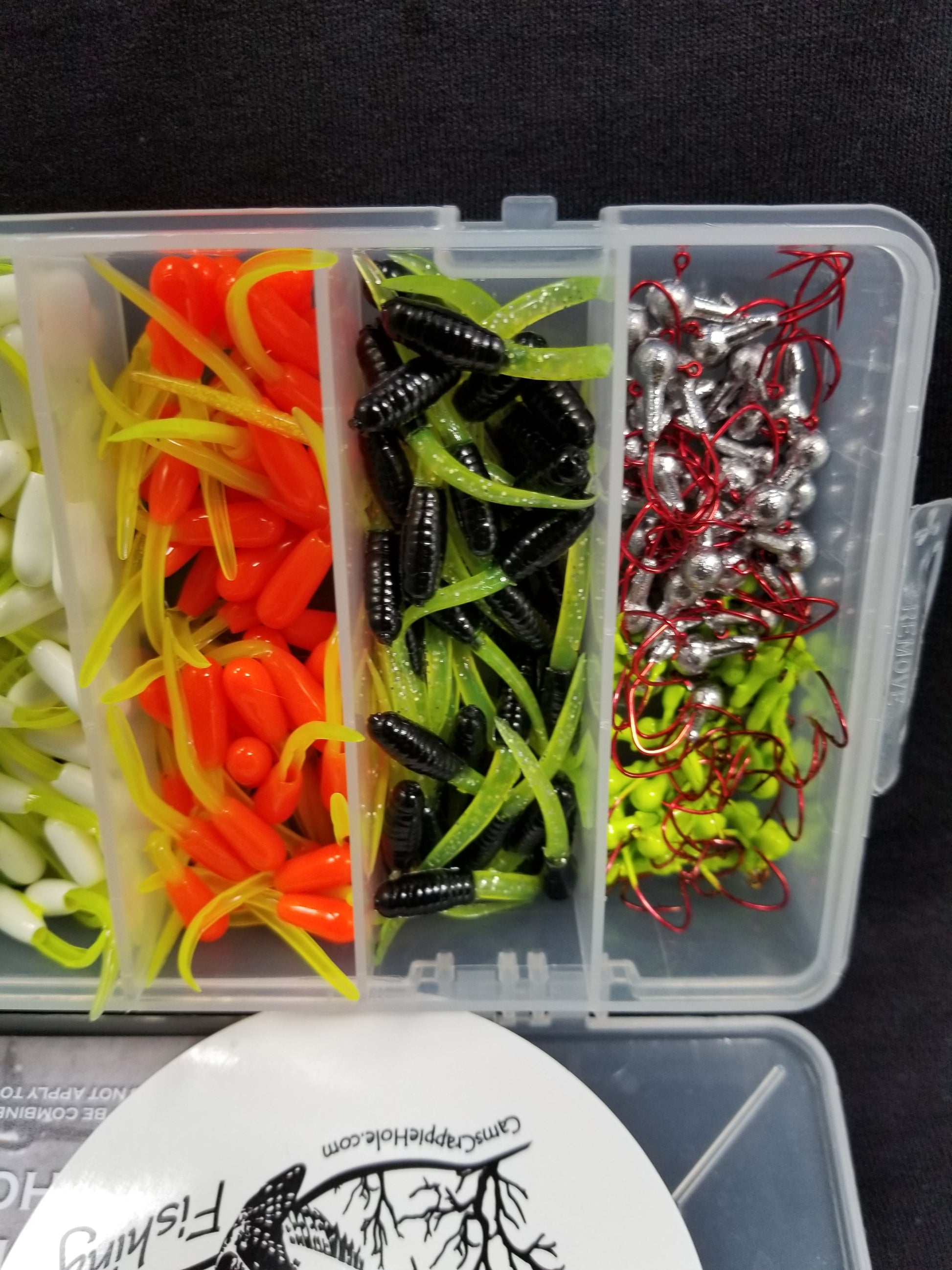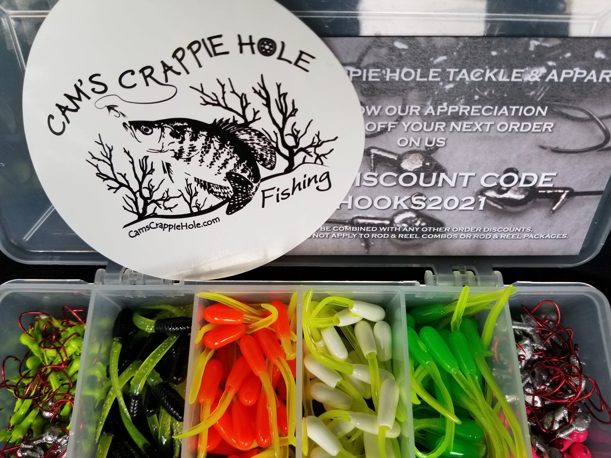 1.5 inch "Stinger" assortment package is great for those that fish water with structure branches, stumps or tree's. Plus we added our world Renowed Nasty Bend Hooks to give you best of both worlds. "Our now world renowed "Nasty Bend Hooks" 20 ct. 1/16 minnow Head #4 hook + 1/32 Round Head with #4 Hook, also included are 4 of our most popular proven crappie catching exotic super soft plastic Glow tubes 100 pieces total. All comes in a reusable Plano box with 6 compartment for easy organization +