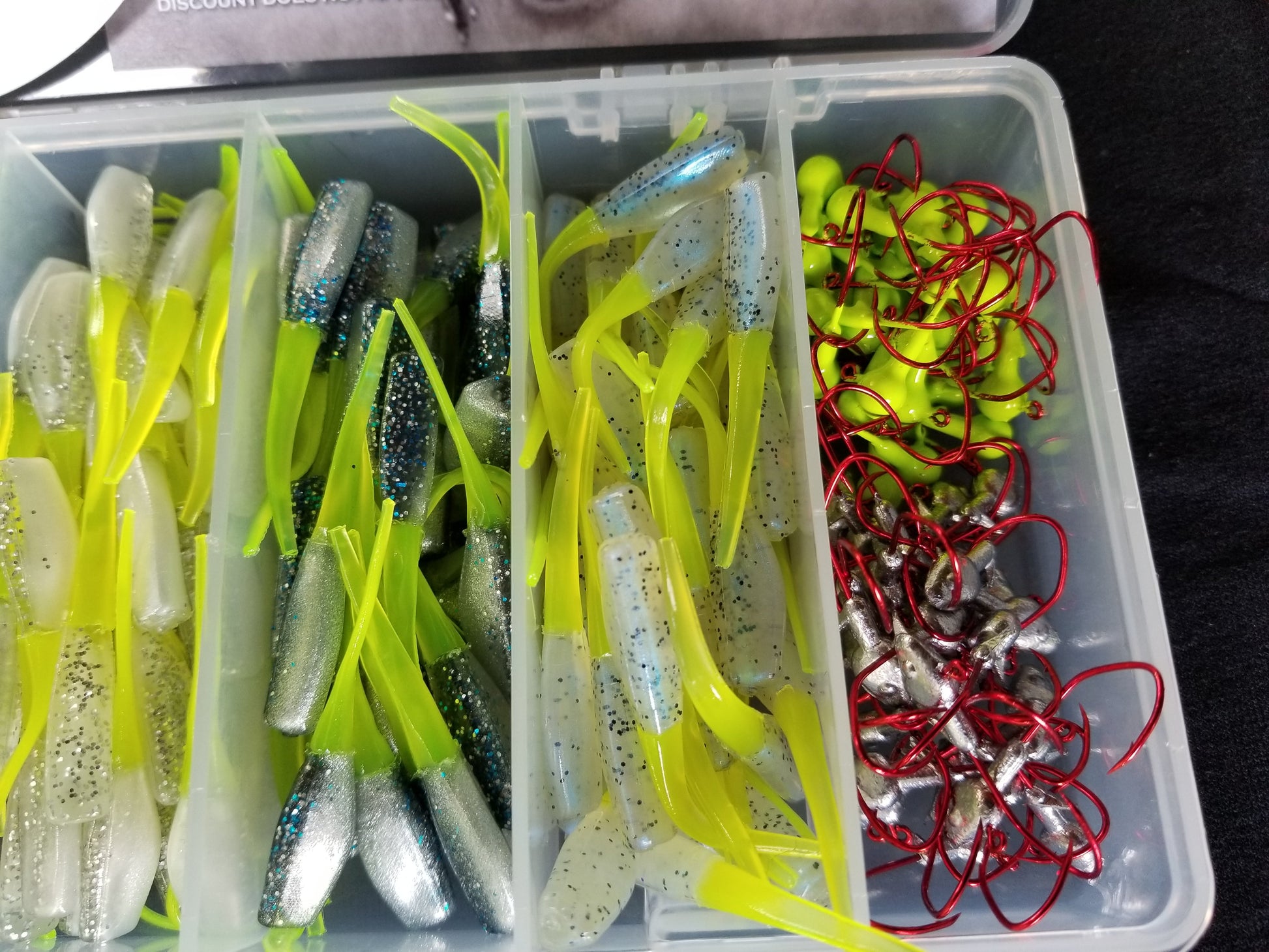 Cam's Stinger Shad [Clear Water] an exclusive only here at Cam's Crappie Hole. This kit is combined with our world Renowned Nasty Bend Hooks. Our Stinger Shad assortment package is the best of both worlds. Everything you need in this kit to hit the water with this starter kit. Included are our Nasty Bend Hooks" 10 ct. 1/16 minnow Head #2 hook + 1/8 minnow Head with #2 Hook, also included are 10ct. Chartreuse 1/16 with #2 red hook and 10ct. Black with #2 red hook + 4 of our most popular proven crappie catching exotic super soft plastic stinger shad 140 pieces total. All comes in a reusable Plano box with 6 compartment for easy organization,