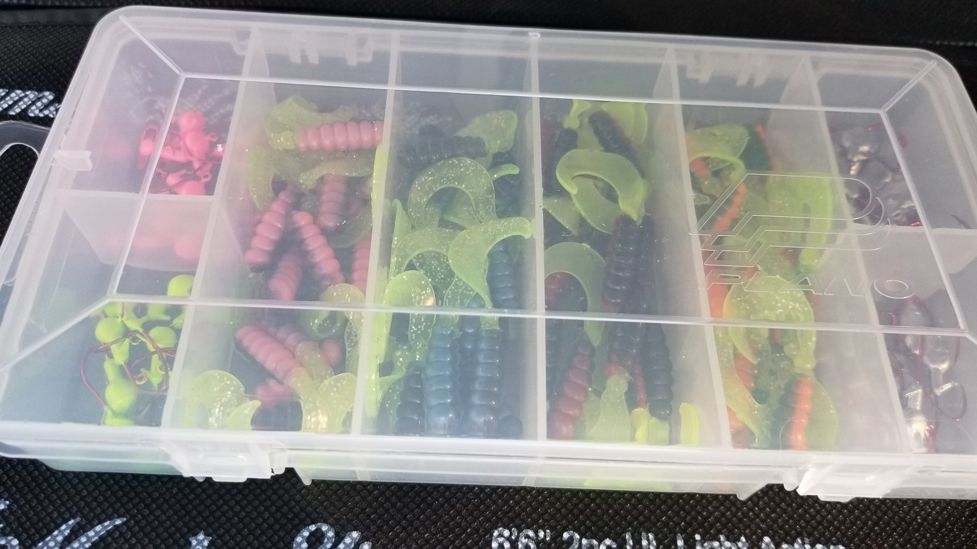 The Cam's world Renowned Nasty Bend Hook Curly Tail starter kit assortment package is the best of both worlds. Everything you need in this kit to hit the water with this starter kit. Included are our Nasty Bend Hooks" 10 ct. 1/16 minnow Head #2 hook + 1/8 minnow Head with #2 Hook, also included are 10ct. Chartreuse 1/16 with #2 red hook and 10ct. Pink with #2 red hook + 4 of our most popular proven crappie catching exotic super soft plastic curly tail grubs 80 pieces total. All comes in a reusable Plano box with 8 compartment for easy organization,