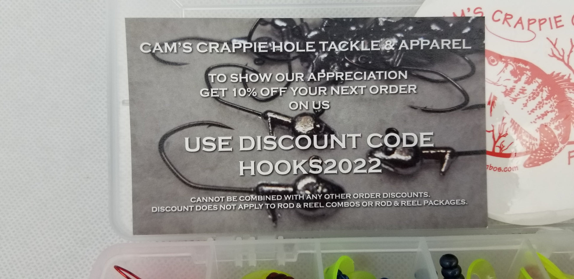 Cam's RED & BLUE Curly Tail [Hologram Flake] an exclusive only here at Cam's Crappie Hole. This kit is combined with our world Renowned Nasty Bend Hooks. Our Curly Tail assortment package is the best of both worlds. Everything you need in this kit to hit the water with this starter kit. Included are our Nasty Bend Hooks" 10 ct. 1/16 minnow Head #2 hook + 1/8 minnow Head with #2 Hook, also included are 10ct. Chartreuse 1/16 with #2 red hook and 10ct. Black with #2 red hook + 4 of our most popular proven crappie catching exotic super soft plastic stinger shad 120 pieces total. All comes in a reusable Plano box with 8 compartment for easy organization,