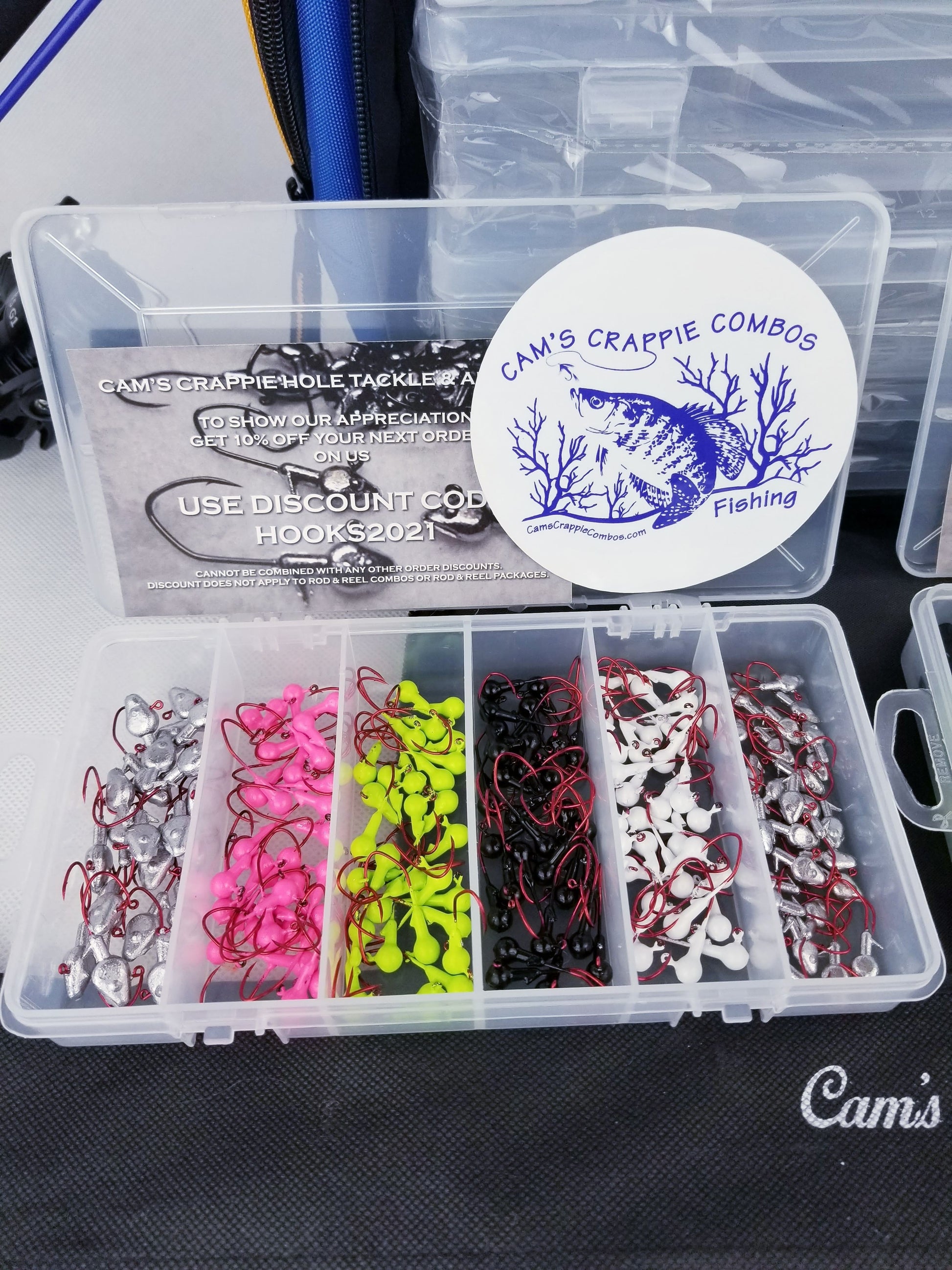 Cam's 60 pc. Hot Pink, Chartreuse, White, Black, and 1/16 - 1/18 non painted minnow Jigheads all #2 deadly blood red hooks. So many of you have asked us to create a "Nasty Bend Hooks" assortment pack with 6 of our most popular colors of hooks. All are made fresh and get their eyes cleaned and I baked each one personally! Also included a Cam's Sticker + complimentary 10% discount coupon on your next purchase. All of this is included in a air tight carrying case ready to be shipped to help you land more crappie. + Free Shipping
