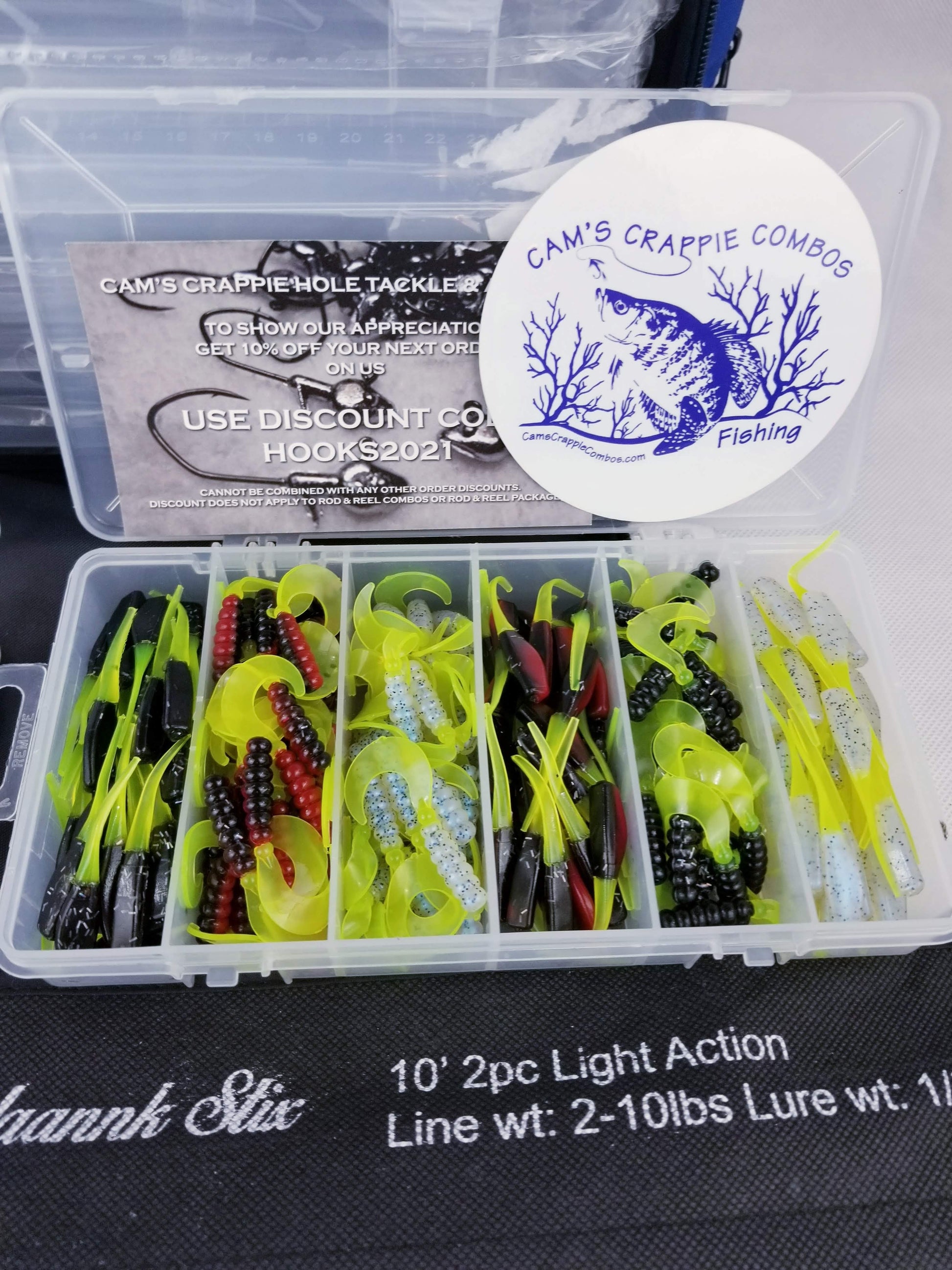 2023 New Cam's Curly Tail & Stinger Shad All Plastics [Hologram Flake] an exclusive only here at Cam's Crappie Hole. This kit gives you the best of both world's. This combination our finest most popular colors all in 1 plano water resistant box. Everything you need in this kit to hit the water with this starter kit. of our most popular proven crappie catching exotic super soft plastic stinger shad and low frequency curly tail grubs. We crated this box for the days that you want to cat and retrieve with the grub or the crappie are holding tight against structure at 8ft. and the day causes for vertical jigging. This box was put together by pro's that know how to catch crappie all around the country. 150 pieces total. All comes in a reusable Plano box with 8 compartment for easy organization,