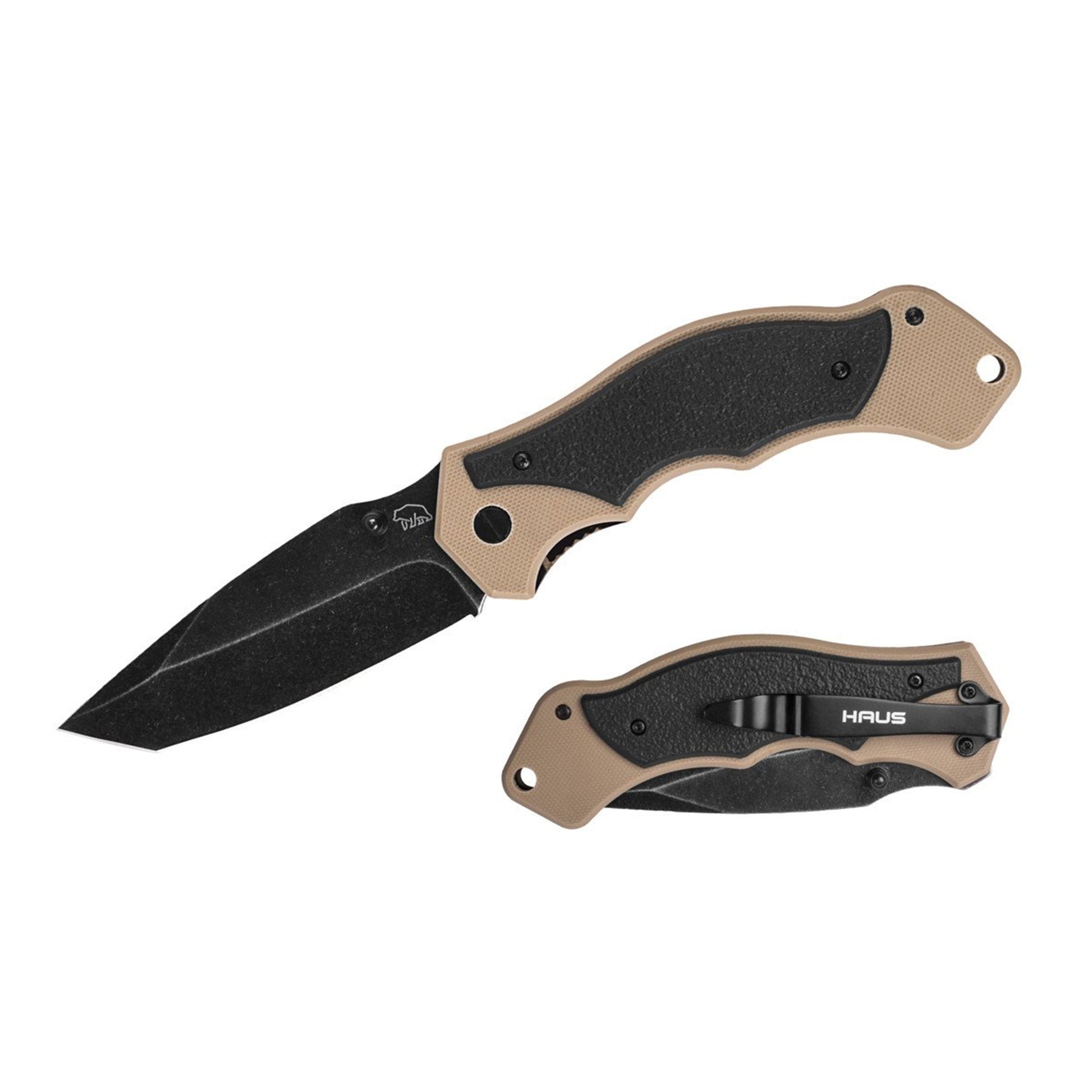 The HAUS Chilkat Folding Knife features a 4-inch, 3-millimeter thick faded dark stone washed blade and a 5-inch G10 handle. This smooth opening folding knife locks securely into place using a reliable liner lock system. You can safely and easily secure the knife to your belt or pocket with the sturdy belt clip included. This knife comes with a thumb stud for smooth, easy opening. The Chilkat has a rugged, outdoor style and the comfortable G10 handle makes this knife perfect for any situation!