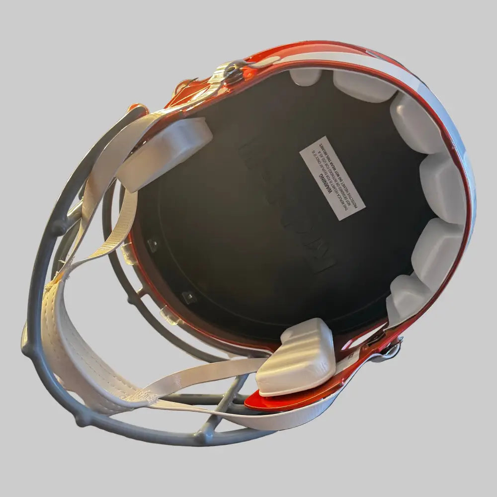 Cincinnati Bengals Full Size Speed Replica NFL Helmet by Riddell. This full size Bengals helmet is designed with a non-wear plate and molded foam jaw pads. a steel polyvinyl-coated face mask, 4-pt chin strap, and elliptical air vents. NFL Team name on back bumper (except Chiefs, Steelers and Giants). The officially licensed NFL helmet is great for autographs and features Bengals team logo decals on both sides. The striking shape of the future. NFL Bengals Replica Speed helmet size medium measures: 12.75"(L), 9.25"(W), 9.75"(H). NFL Cincinnati Bengals Full Size Speed Replica Helmet. (NOT FOR WEARING)