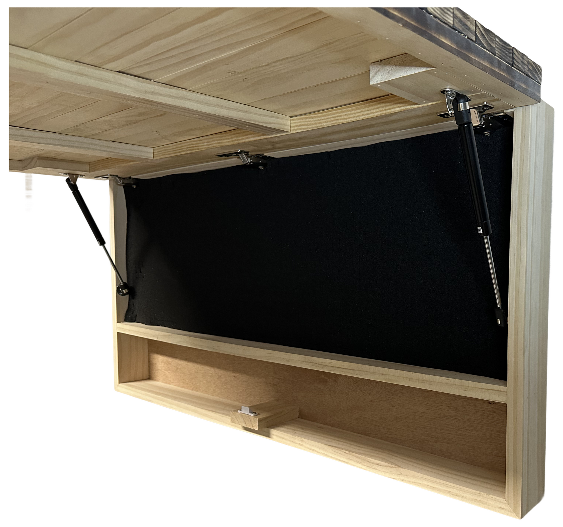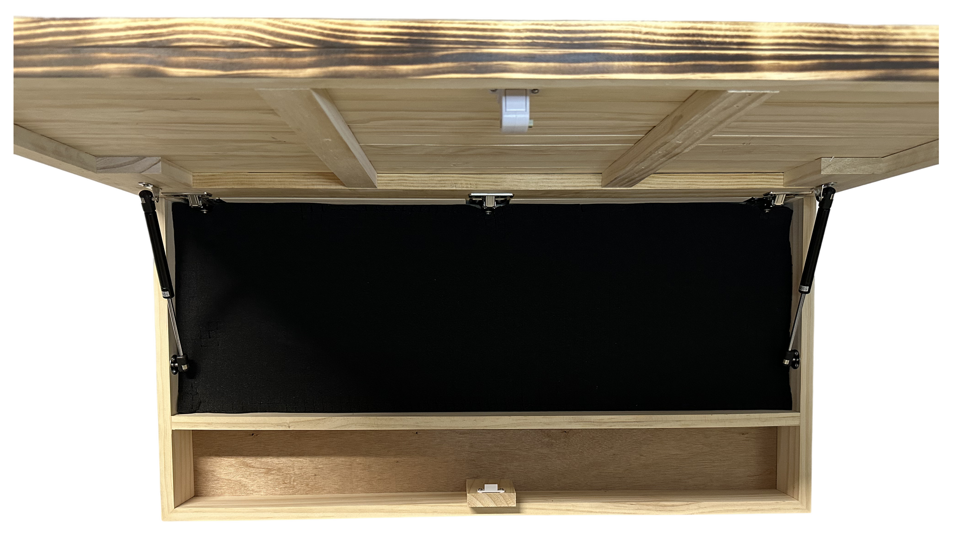 This wall-mounted hidden gun cabinet is spacious enough to store a standard AR-15, multiple handguns, magazines, and other essential accessories. It also includes a lower shelf for additional storage, making it both functional and stylish.