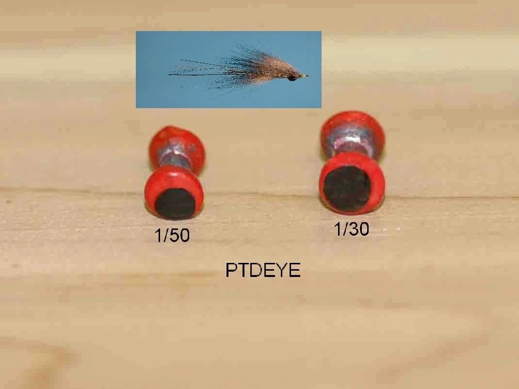Painted red with black pupil and are available in three sizes X-small, Small, and Medium. Very effective when used on the Clouser Deep Minnow. They are packed 10 per bag.