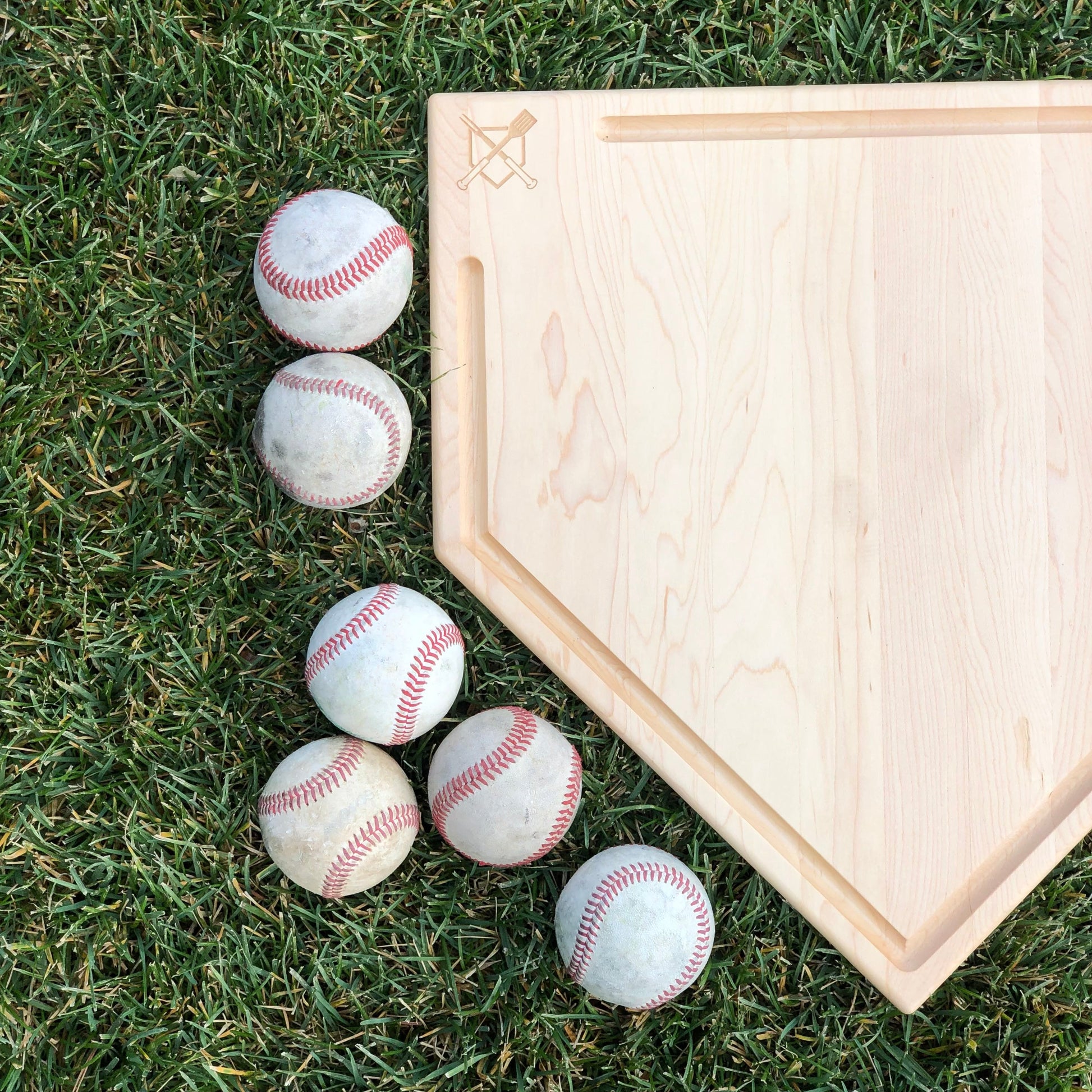 The full size (17" x 17") Baseball BBQ Home Plate with trough is finally here! We improved our customer favorite Home Plate cutting board by popular demand by making it bigger and better. Now built to the exact dimensions of a regulation home plate, this cutting board was crafted for classic backyard bbqs! Made in the USA, the Home Plate cutting board sports an edge-grain construction with solid Western Maple. The 17" x 17" hardwood cutting board captures the iconic center of baseball action with its home plate design. The built in trough is perfect for catching messes around home plate! Whether you're prepping food for the grill or serving friends at a playoff party, nothing shows your love for baseball like the Home Plate cutting board.