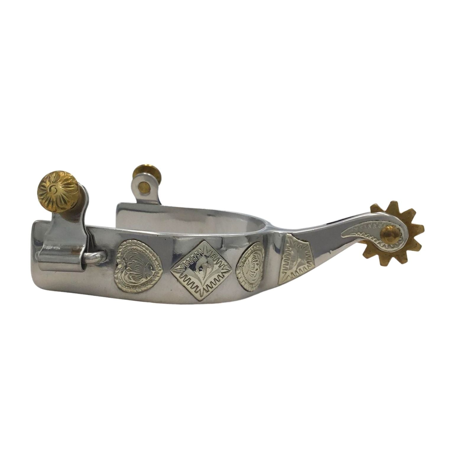 These great looking spurs can do it all, they fit a boot, ride well and allow effective communication with a horse. A stainless steel spur with engraved nickel silver diamonds and hearts overlay. 1" band with 2 " shank and 10 point rowels.
