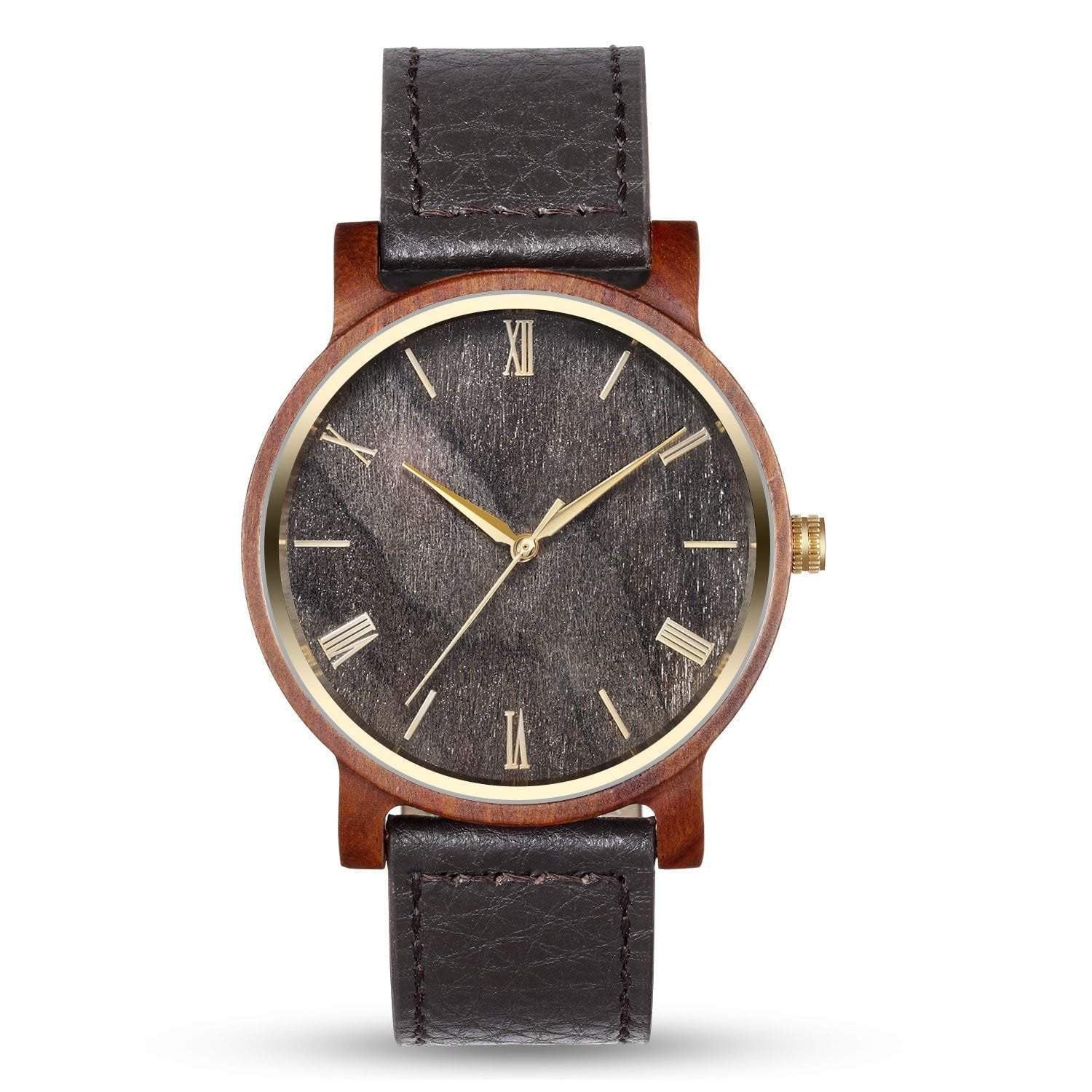 A wooden watch, that offers a beautiful wooden frame, that is paired with a leather strap. This wooden watch dial showcases a textured wooden base, that is brought to life using golden Roman numerals and hands.