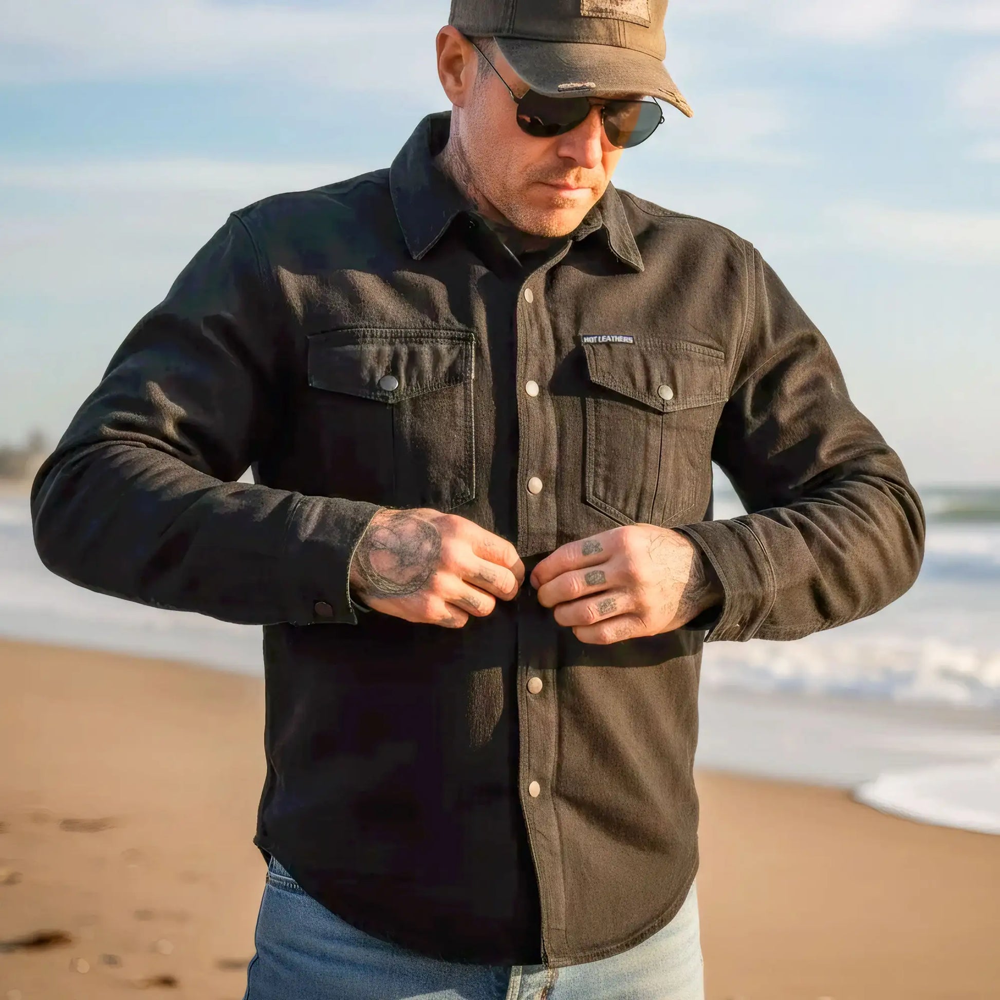 Cycle Source Magazine "Best Apparel Product" 2020 Winner. Yes ,you voted and it came out on top . This is the black version of our famous armored riding flannel line. Great features including dual gun pockets, media tech pocket , outer zipper and button flap front .