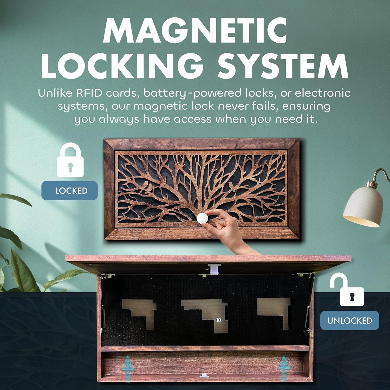- SECURE MAGNETIC LOCK: This gun concealment furniture uses a magnetic key system that never fails when needed most. Unlike battery, biometric, or RFID locks, it provides hidden gun storage with secure, reliable access every time and peace of mind without tech failure.
