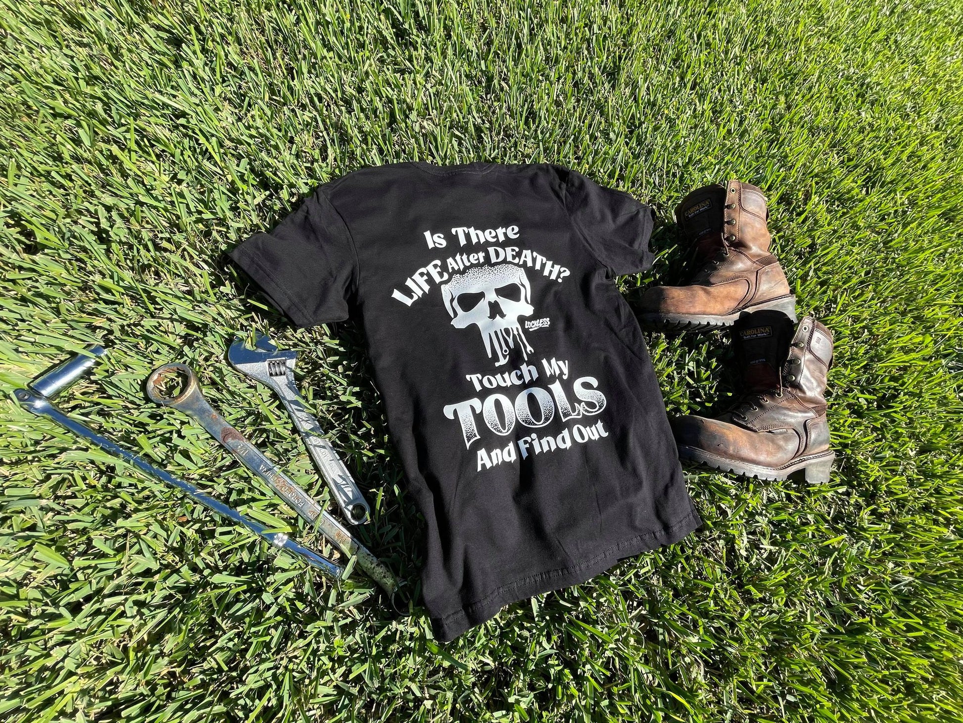 At Luckless Outfitters, we believe in asking the important questions. Like, is there life after death and why did you just touch my tools. The Life After Death T-Shirt is our polite yet threatening reminder that some things are sacred, and your hands are not invited anywhere near them.