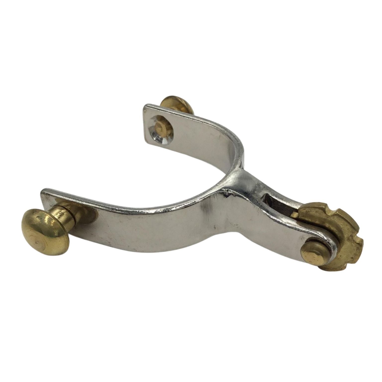 Nickel plated toddler sized spur with a 1/2" band and 1 1/8" shank with fixed brass buttons and a star burst rowel. The littlest cowboy or cowgirl will be all set for the next rodeo.