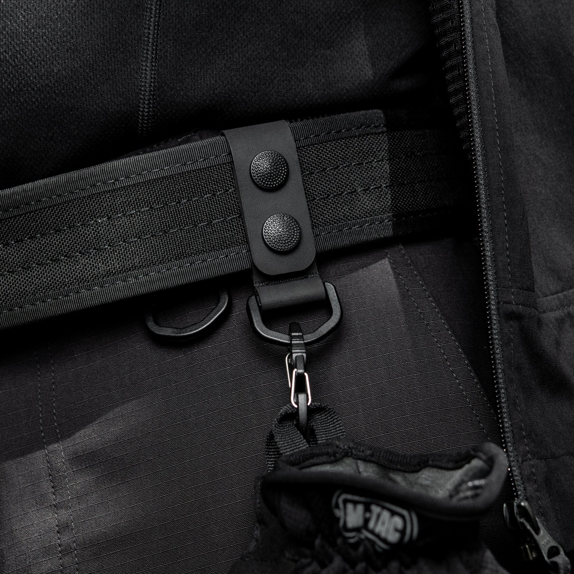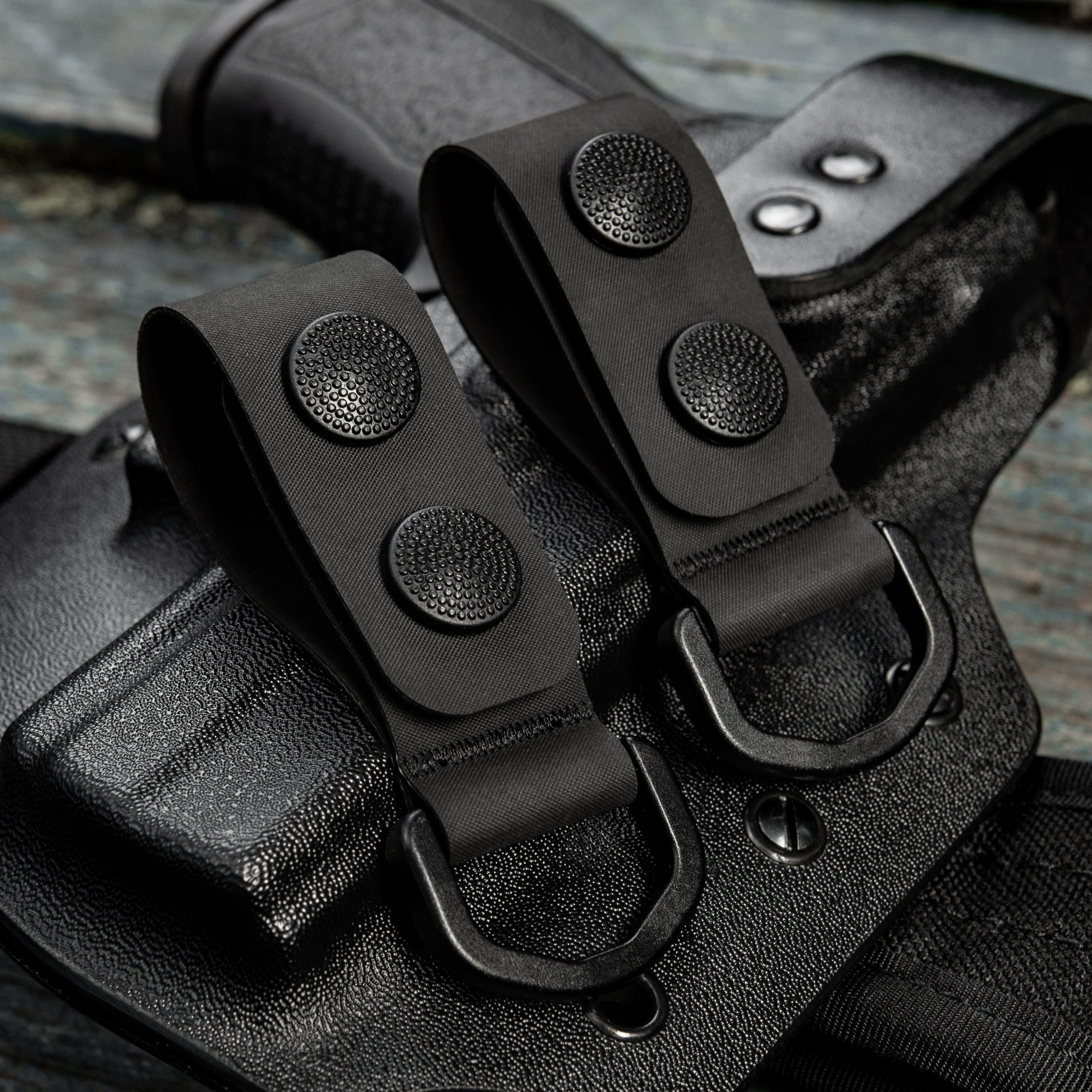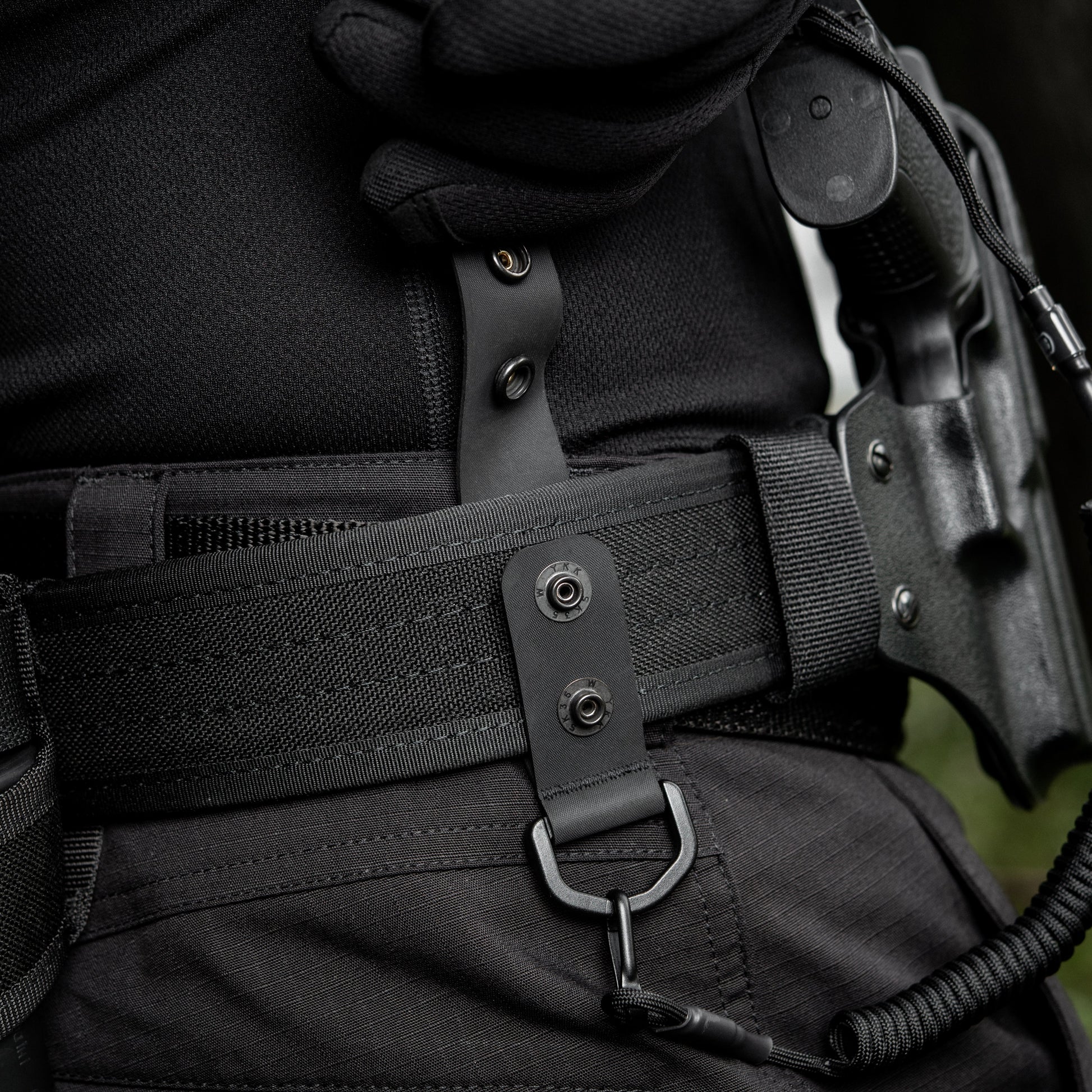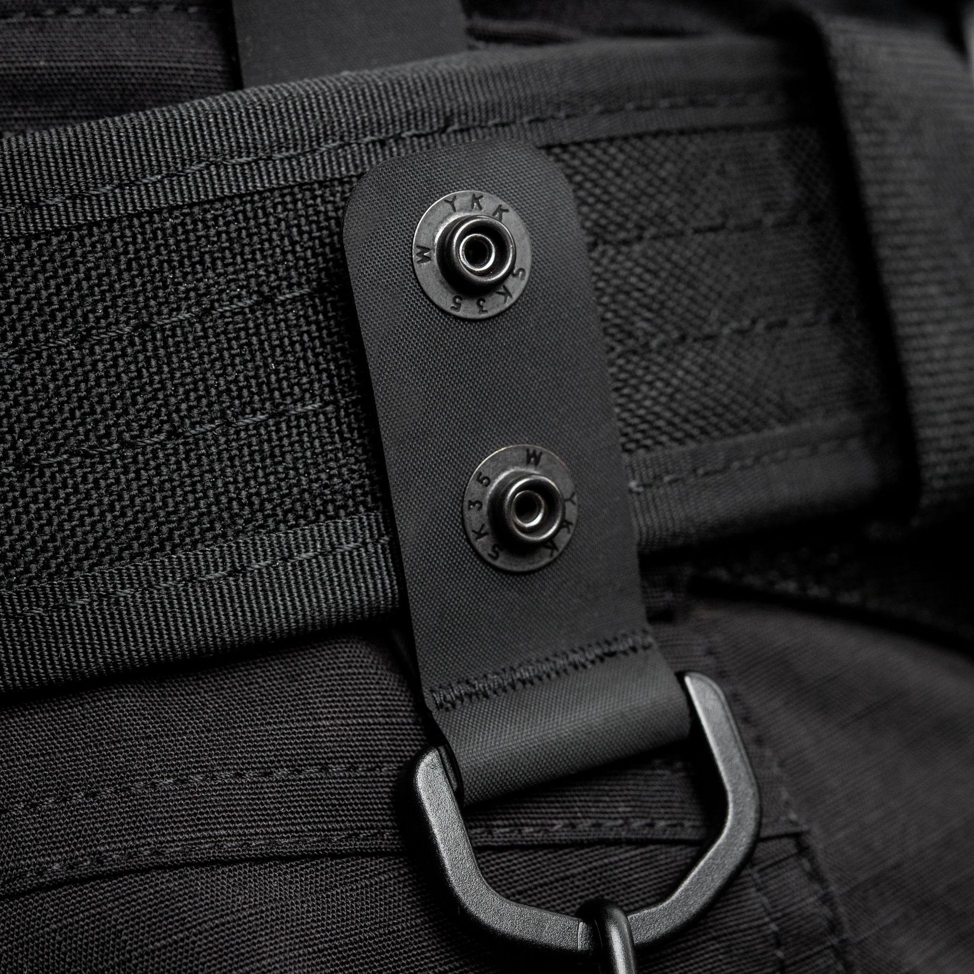 Hypalon is a chlorosulfonated polyethylene (CSPE) synthetic rubber that is resistant to chemicals, extreme temperatures and UV. The design of the mount is ingenious in its simplicity. It is a sling 5.5" long and 1" wide. You can fasten the fastener with both buttons - then its girth will be enough to connect two standard-width belts (up to 21.6" wide). You can move the edge of the attachment and fasten it with 1 button (YKK) - this option will make it possible to connect a standard trouser belt with a wider belt (up to 2.7" wide). From below, each mount is equipped with a D-ring. It can be used both for hanging small tactical equipment (using carabiners, etc.) The same goes for attaching a safety cord.