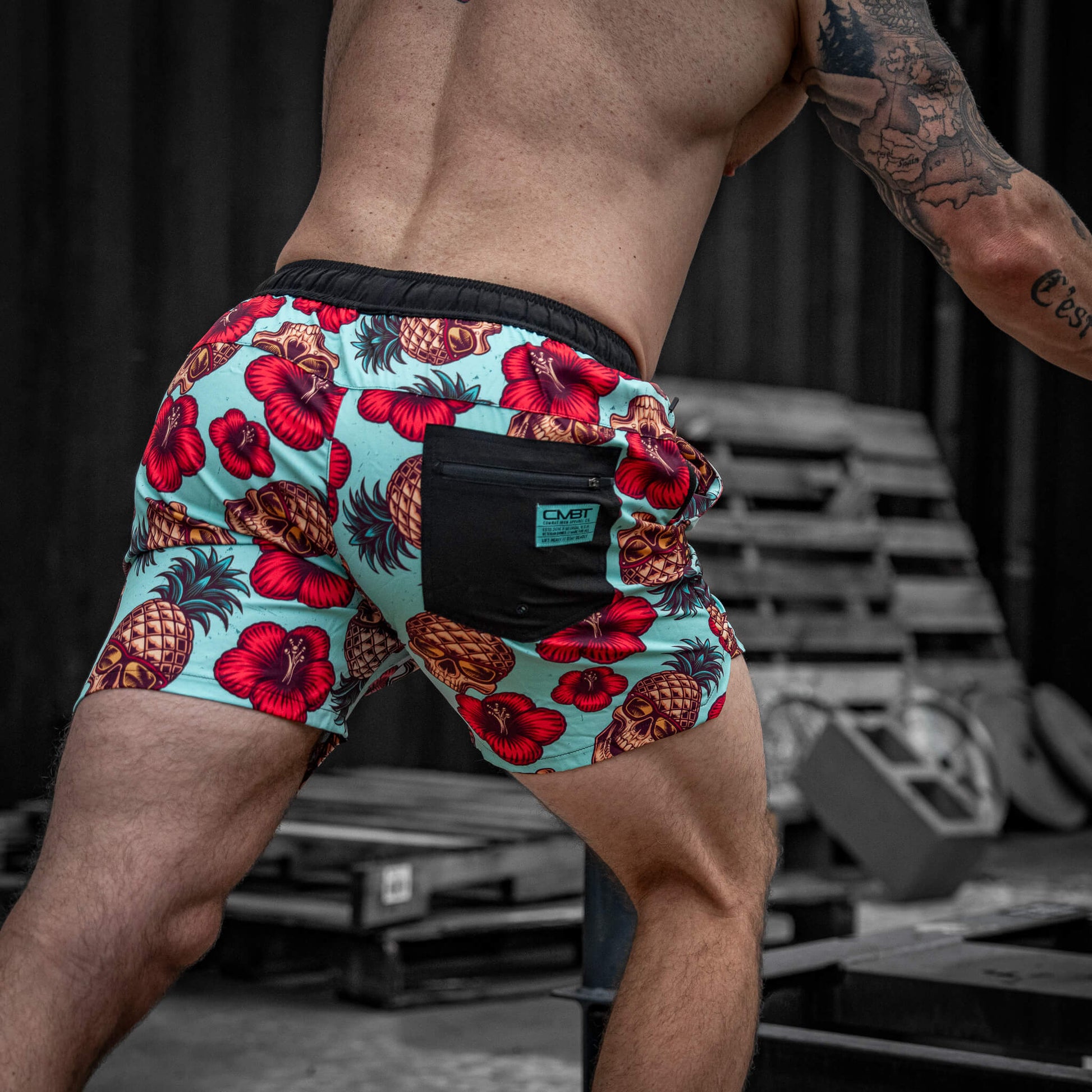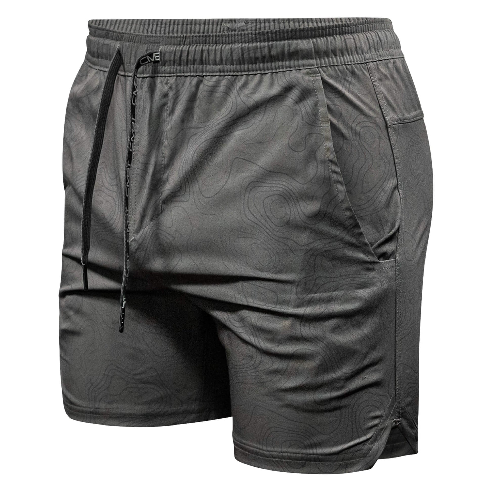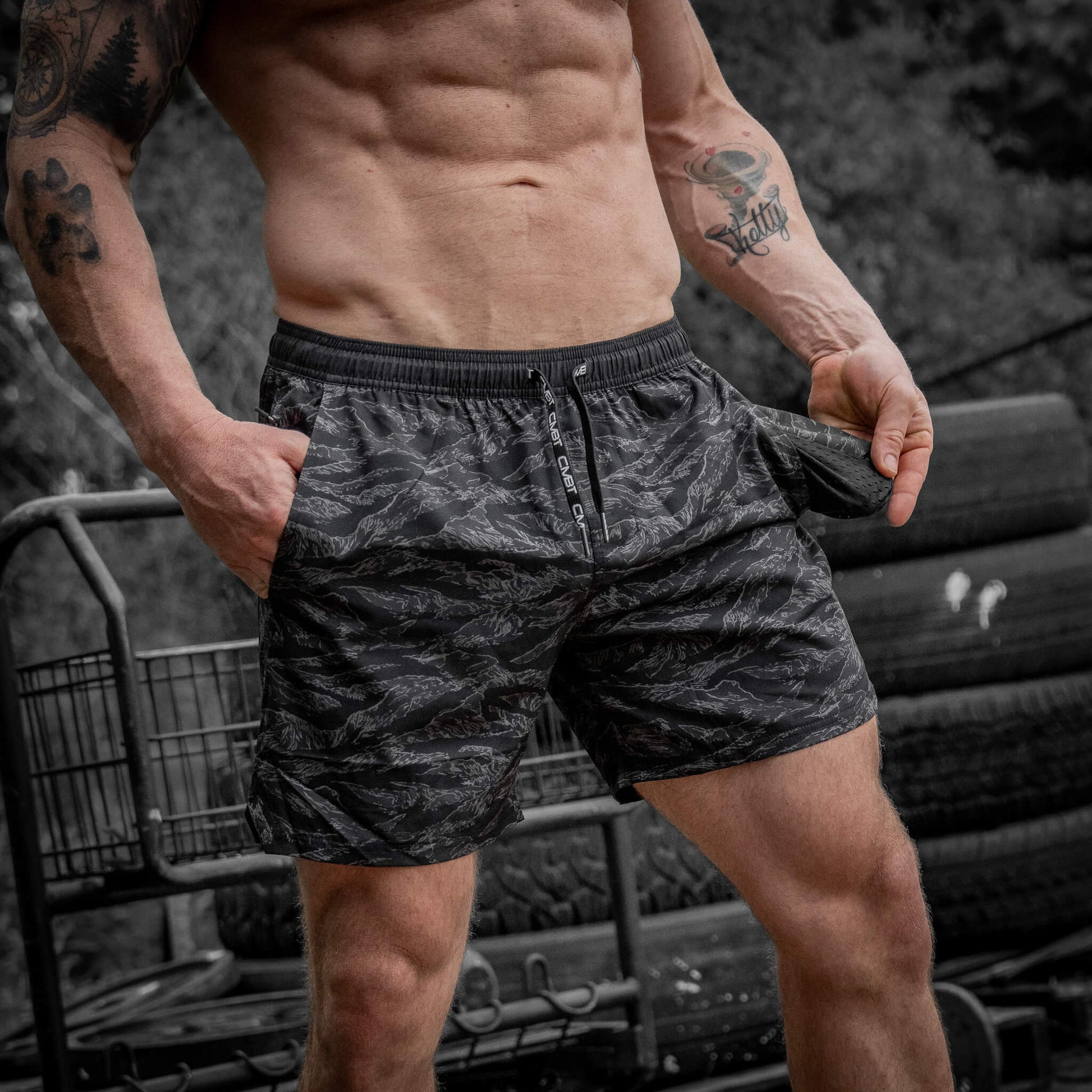 Men’s hybrid training shorts with 5.5” inseam, quick-dry breathable fabric, secure zip pockets, and athletic fit designed for gym training, running, and swim use.