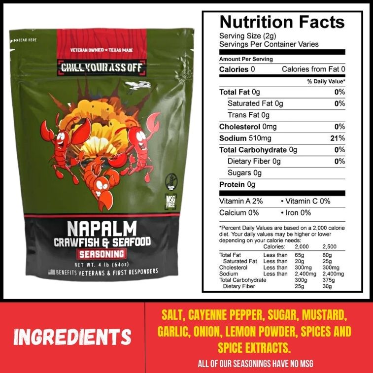 Napalm contains all the necessary seasonings to boil your crawfish or your favorite seafood. Simply pour into the water and bring to a boil! Each 4 lb bag will boil approximately 30-55 lbs of crawfish.