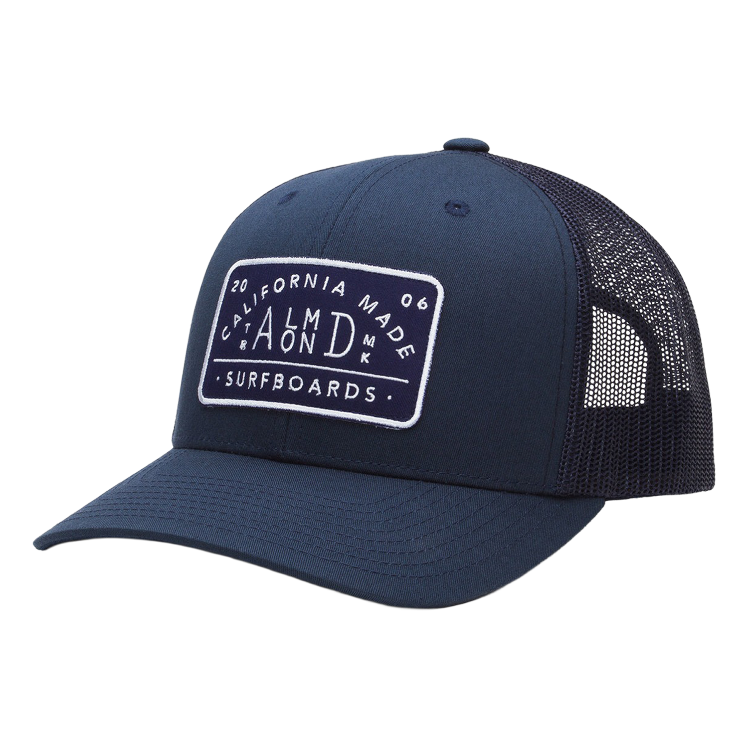 Navy Blue Trucker Hat with Almond's "California Made Surfboards" woven patch. This hat fits a broad range of head sizes and shapes.