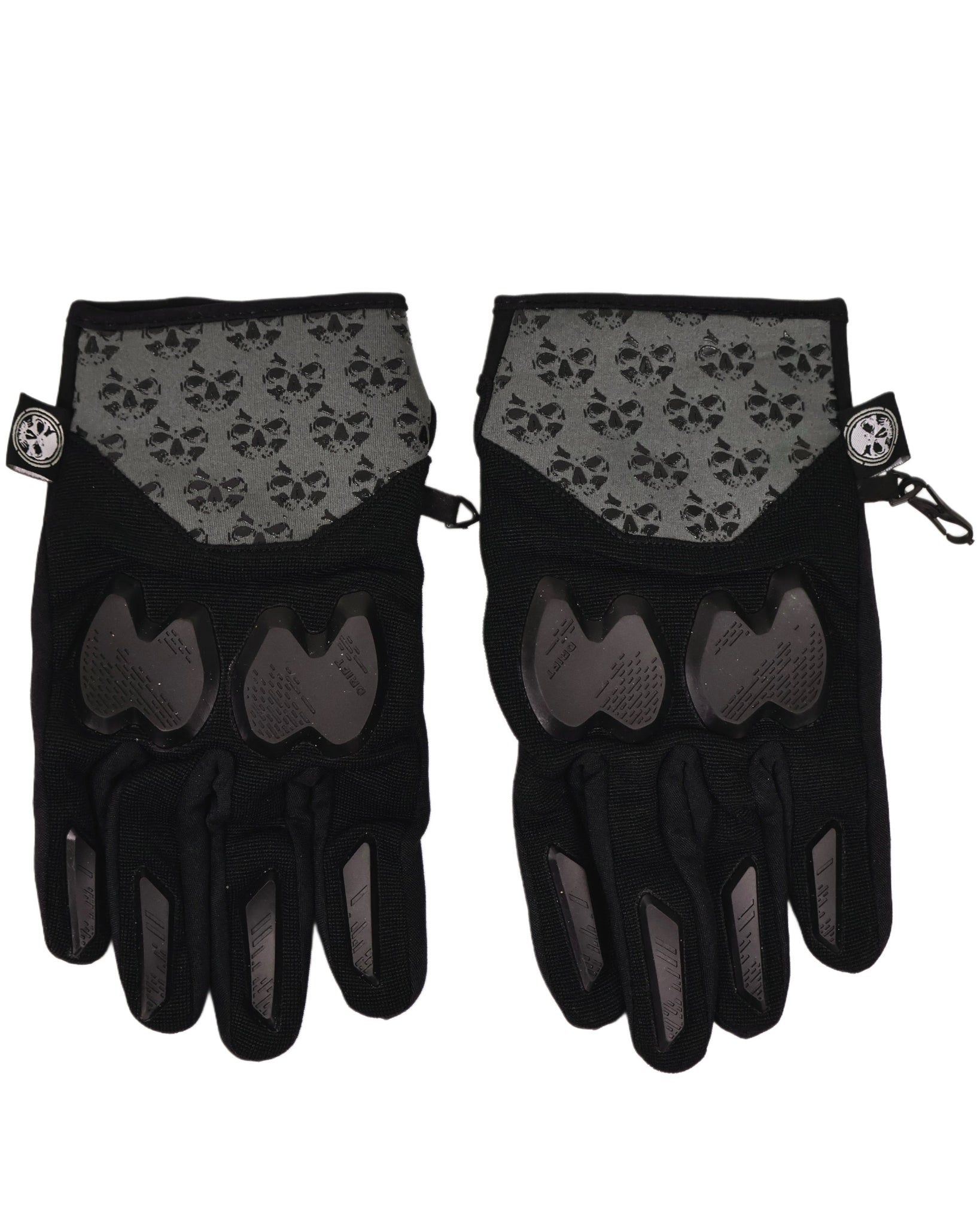High performance riding gloves, featuring padded knuckle guards, finger guards, genuine leather padded palms, smartphone compatible fingertips, Velcro wrist closures, and stretch spandex body.