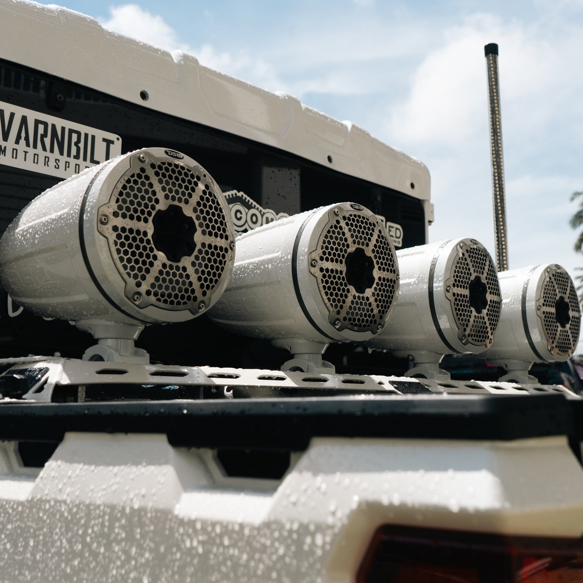 New and redesigned tower speaker to handle more vibration, abuse, and be overall louder. These models have a new and redesigned clamping system that is much stronger overall than the previous model and has been heavily enforced. We also include brightly lit LED on the speaker, rings, and DS18 logo.