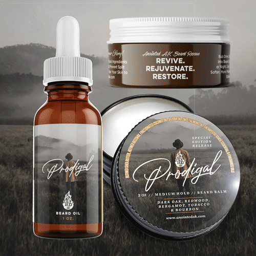- Beard Oil: 1 oz. of Prodigal Beard Oil in an Amber Boston Glass Bottle