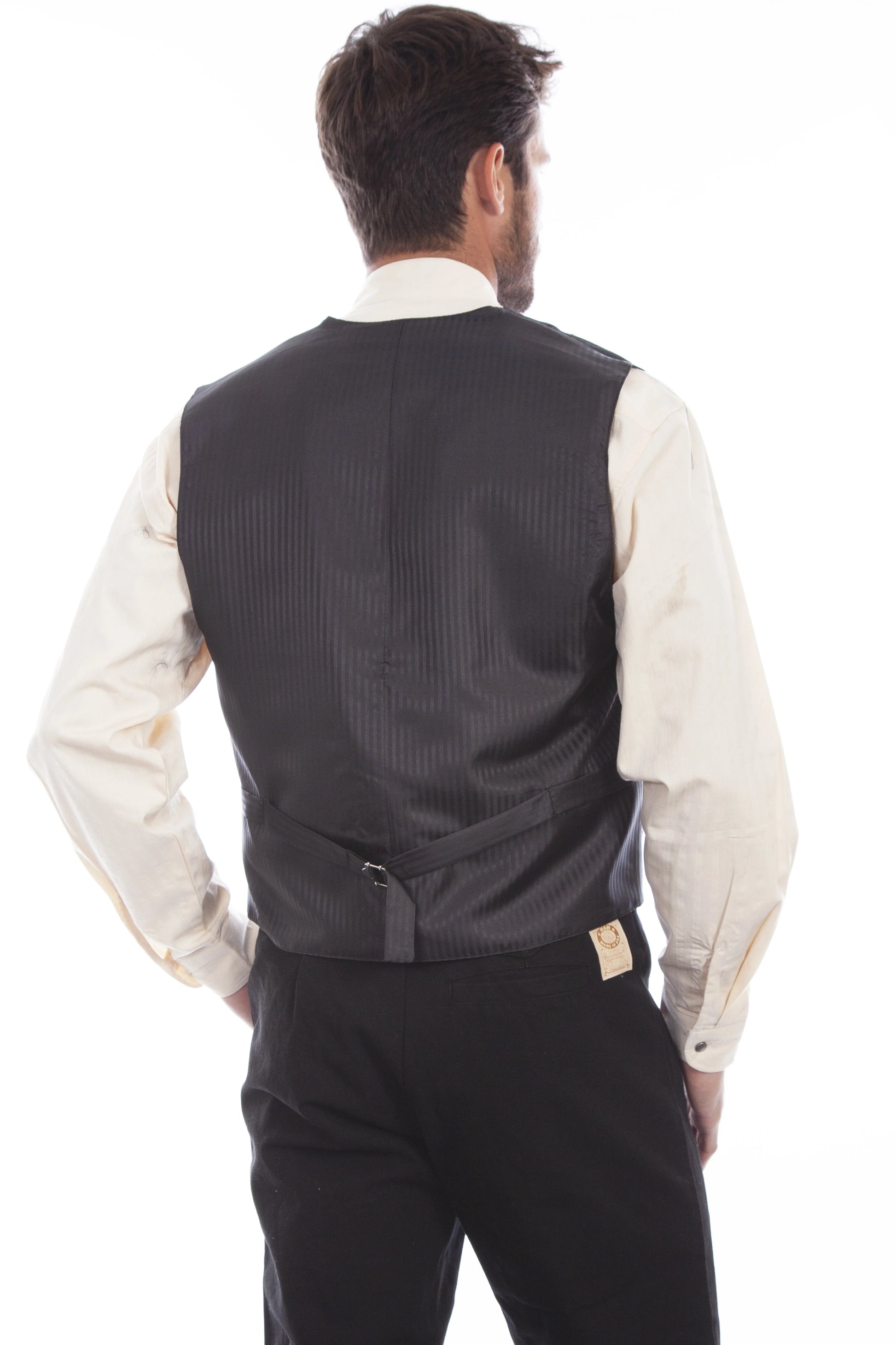 Elevate your formal wardrobe with this classic paisley vest. Featuring elegant notched lapels and a covered button front, it exudes timeless sophistication. Two welt pockets provide practical storage for a watch and chain, while the adjustable back strap ensures a perfect, tailored fit.