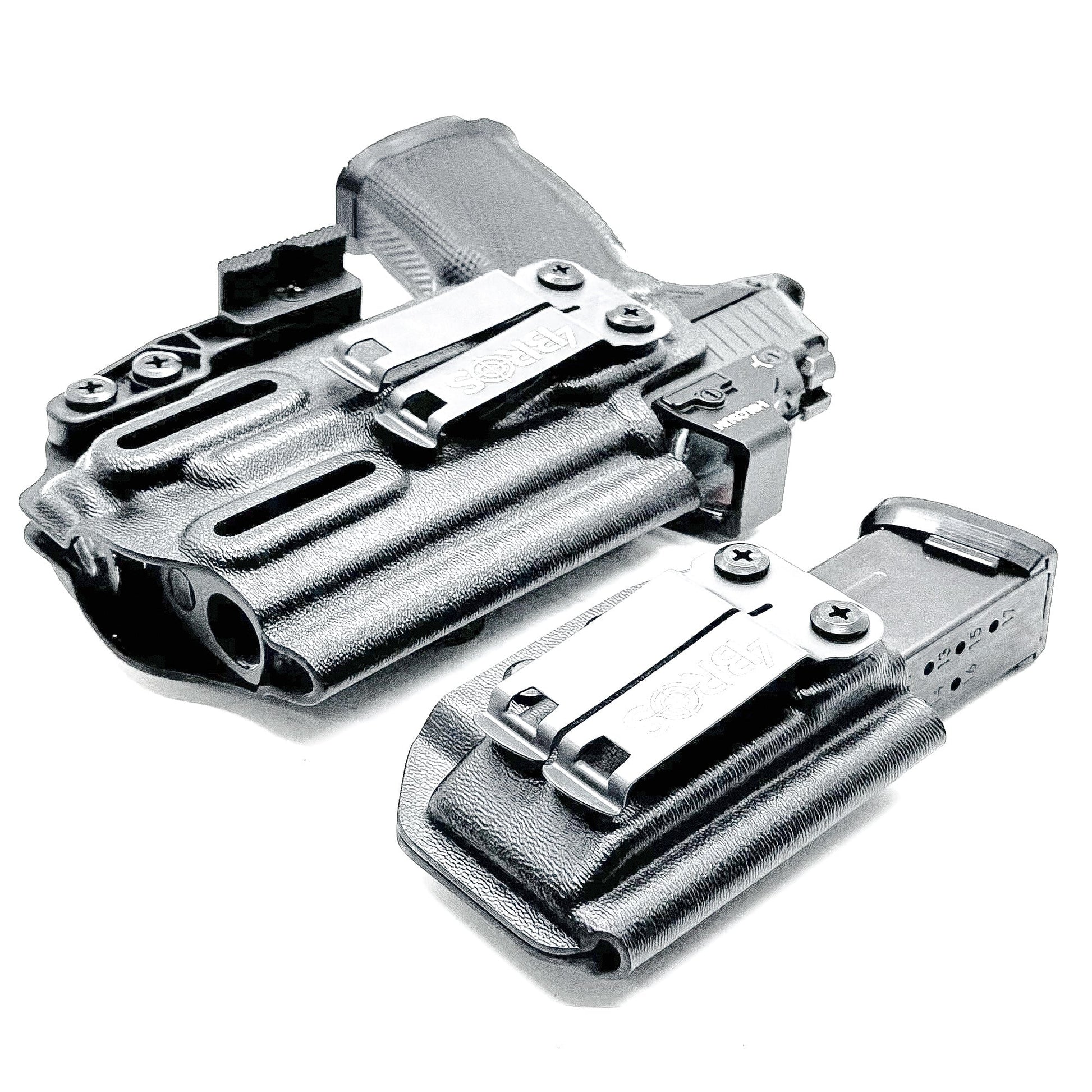 The standard setup includes a Modwing on the holster and either the Discreet Carry Concepts Monoblock or Ulticlip Ultituck belt attachment on both the holster and mag pouch.