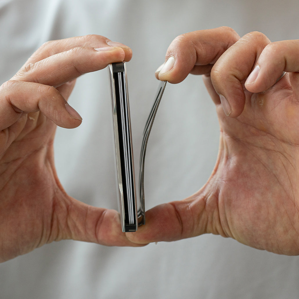 For those who demand even more from their carry, the SK1 is also available with an integrated titanium clip — a robust and lightweight addition that can securely hold up to 10 folded bills and additional cards or documents. Thoughtfully designed ventilation slots and precision-cut notches enhance both form and function: improving grip, reducing bulk, and allowing essential documents to be held tightly in place without compromise.