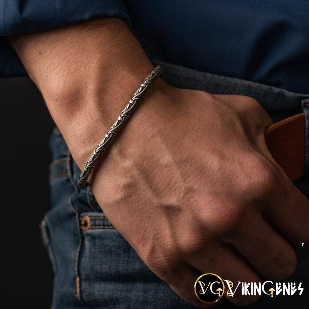 This beautiful hand-crafted Viking bracelet depicts the head of a dragon on each end. Dragons were very prominent in Viking / Norse mythology. In particular, the monstrous beast known as Jormungandr was a dragon-like serpent created by Loki whose existence threatened the entire world, forcing Odin to banish it to sea. The origins of this bracelet come from a 1000+ year old model found in an archaeological dig site in Gotland, Sweden.