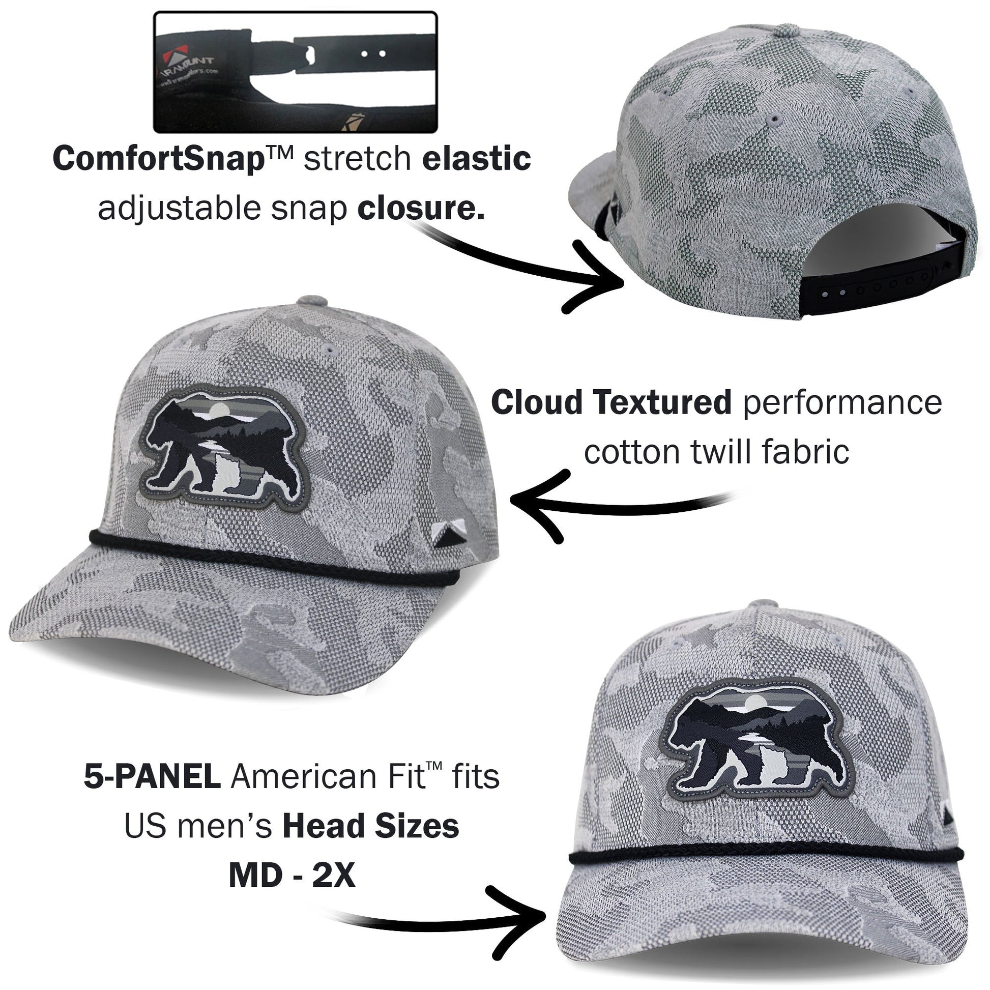 The sunset bear rope cap is built on our Base Camp 5-Panel trucker hat style. This cap features a quality 10k stitch count sunset bear patch on our cloud textured cotton twill fabric. Our COMFORT SNAP™ closure couple the stretch of elastic with the adjustability of a snapback. Lastly, This new black bear hat features American Fit™ sizing which fits men's head sizes MD - XX.