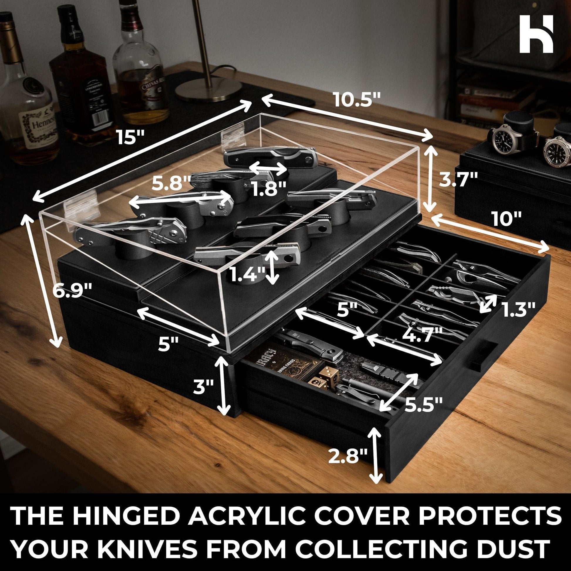 Your Favorite Pocket Knives on Display — Stop storing your knives in zip-up wallets or shadow boxes, and start displaying them with pride. This display case for knives offers 7 posts to showcase your most adored knives up to 5 ¾ inches. The patented two-tier design includes a drawer to store additional knives, small tools, EDC gear, and 12 additional blades up to 5 inches