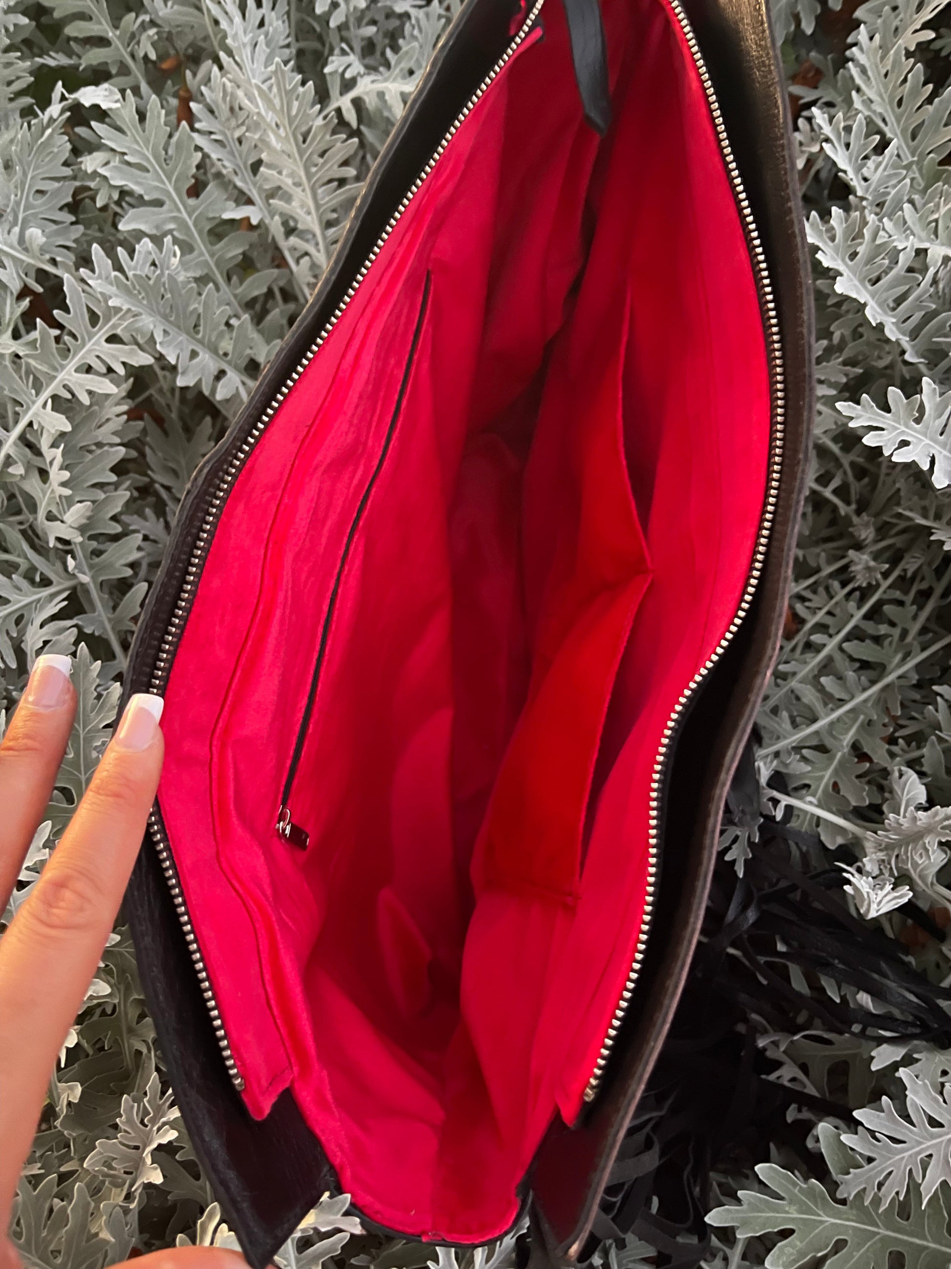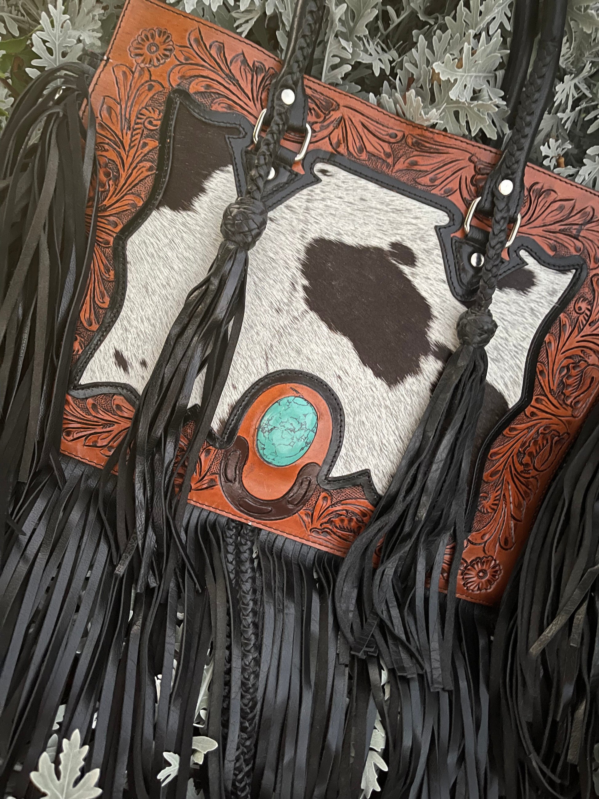 The Nashville Gunner boasts a sexy red velvet interior, a Concealed Carry Pocket in the rear accessible for left/right carry, huge storage capacity, both top handles and a shoulder strap, and a beautiful faux turquoise stone. The interior contains two cubby pockets and one zipper pocket. Please note our latest batch was made without the red velvet and was made with a brown velvet material. The photo does show the layout of interior, however the color will be different for the interior on this batch. Made with genuine leather and cowhide. The Nashville Gunner is a head turning Gem!