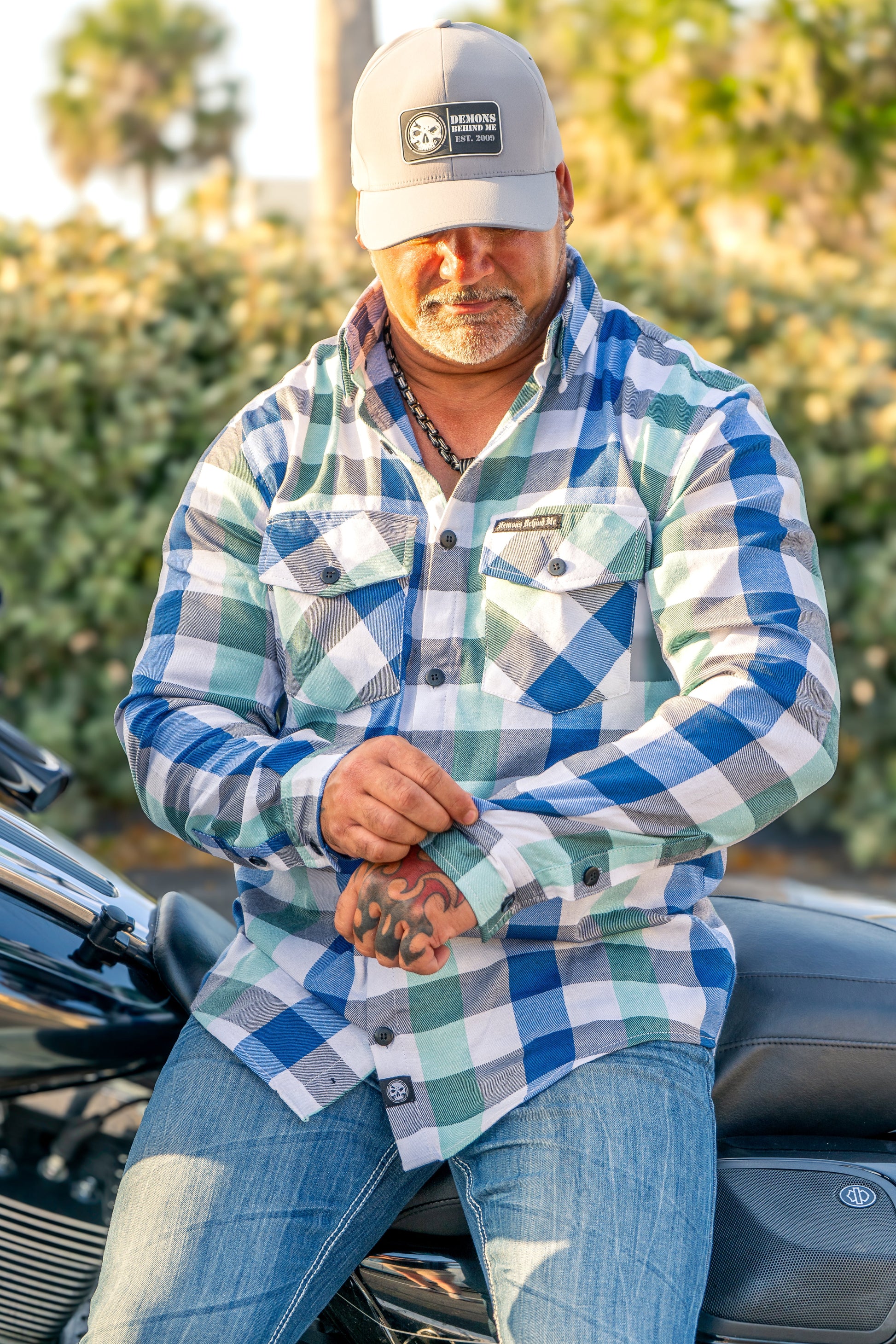 Our final flannel for Spring 2025, The "Sea Breeze" flannel featuring calming ocean colors, invisible snap down collars along with our latest logos, and decorated more subtly and cleanly.