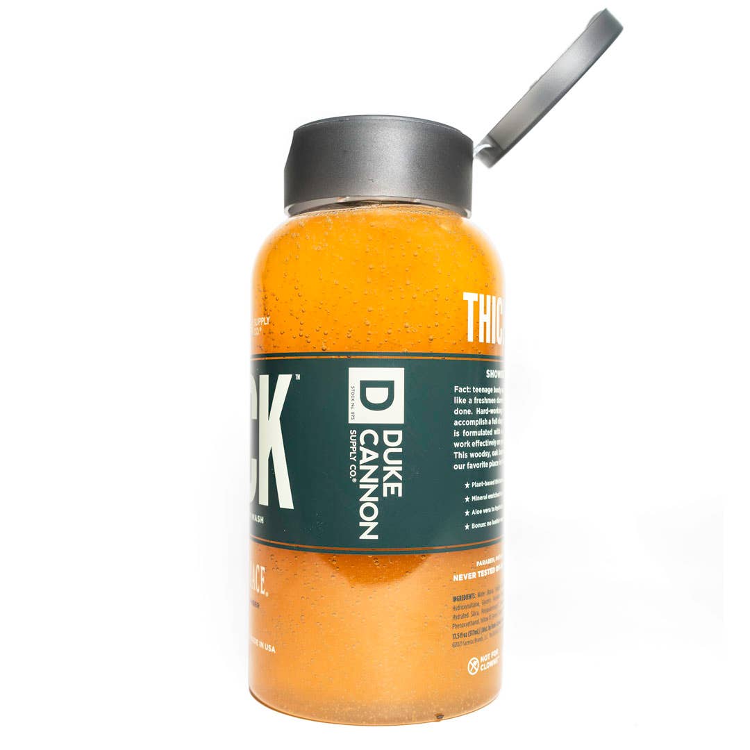 Fact: teenage body washes are weak, watered down, and smell like a JV locker room. Simply put, they don't get the job done. Hard-working men require a shower of substance to accomplish a full day's work. That's why Duke Cannon's THICK is formulated with a noticeably higher viscosity and built to work effectively on your body, not spew down the shower drain. Our latest scent is inspired by our favorite place on earth, The Buffalo Trace Distillery. Notes of amber combine with a woodsy, oak barrel foundation for a rich scent that smells as good as bourbon tastes. PRODUCT SPECS: 3X THICKER than teenage body wash Plant-based thickeners for superior lather Does not smell like you had one too many at the pub. Woodsy, oak barrel scent with notes of amber Mineral enriched to naturally exfoliate Contains Aloe vera to hydrate and protect Bonus: no loofah required Paraben, phthalate, and cruelty-free Size: 17.5 oz. *Never tested on animals. Just bad interns.