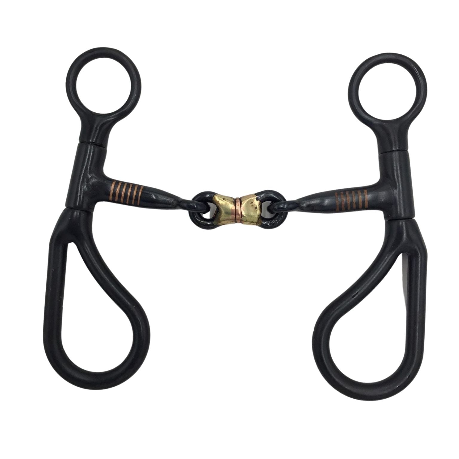 This training bit has 6" black steel cheeks with 5" copper 3 Piece snaffle mouth. Great for horses learning to use a bit.