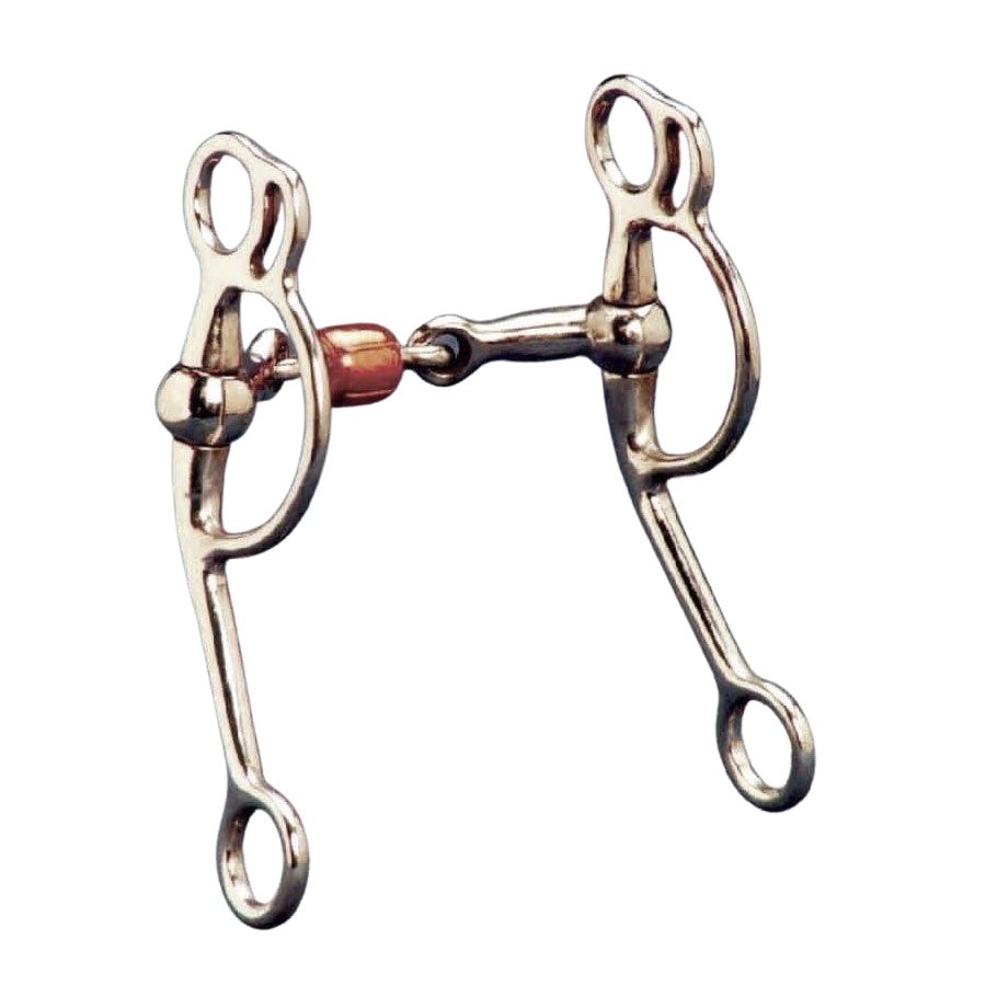 6 3/4" stainless steel cheeks and 5" 3-Piece mouth with sliding copper roller. This bit helps to cue the horse slightly ahead of the full cue and helps the horse anticipate commands. Low to moderate leverage.