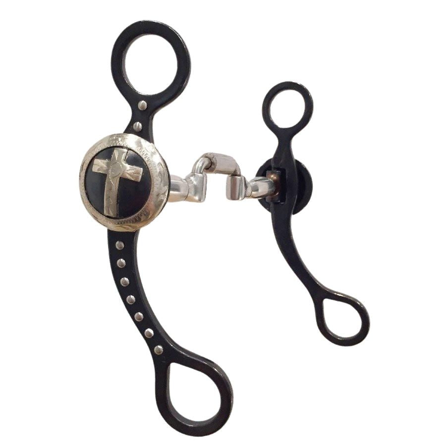 A balanced flat top curb bit with five way flexibility. 7 1/2" antique brown cheeks with a nickel silver concha. 5" "No Pinch" mouth with copper rollers. This bit provides medium leverage and is for well trained horses.