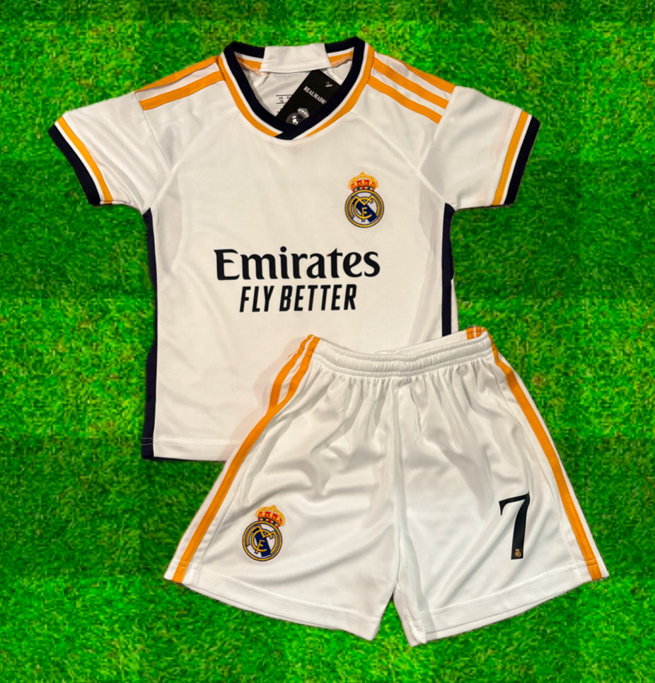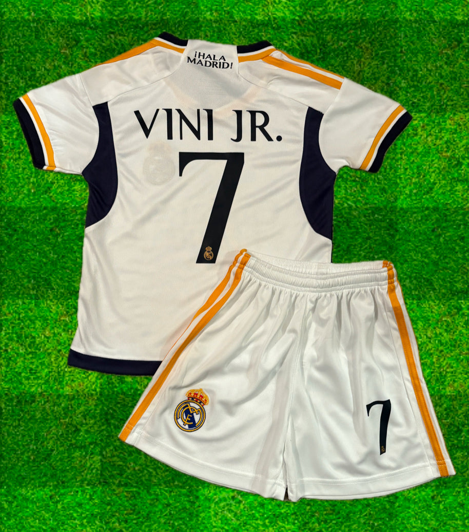 Vini Jr. Kids Soccer Jersey & Shorts Set – Real Madrid (White with Gold Trim)