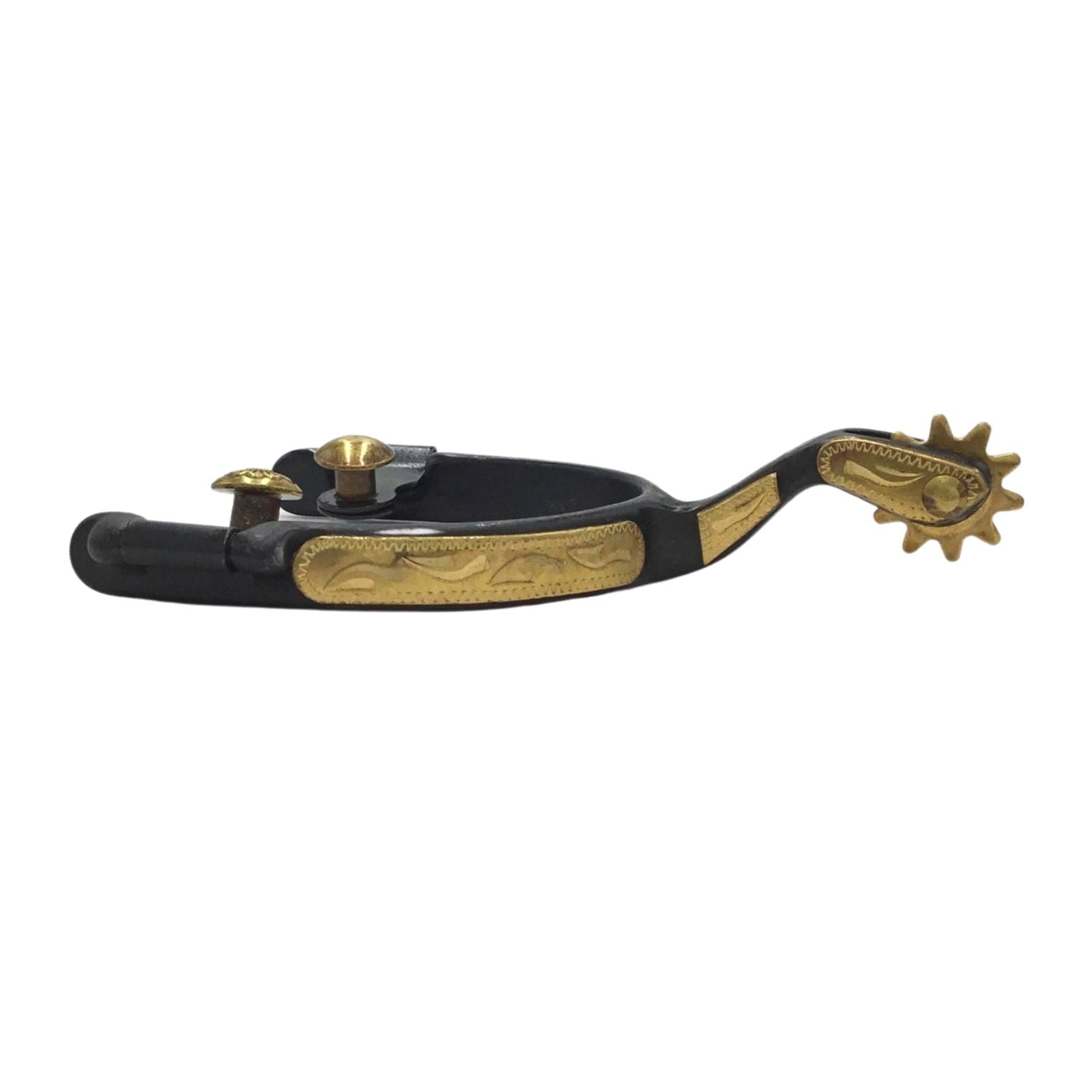 A great fitting ladies spur that is light yet strong and communicates well. A black steel, ladies roper spur with 1/2" engraved band. Brass rowels and brass buttons.