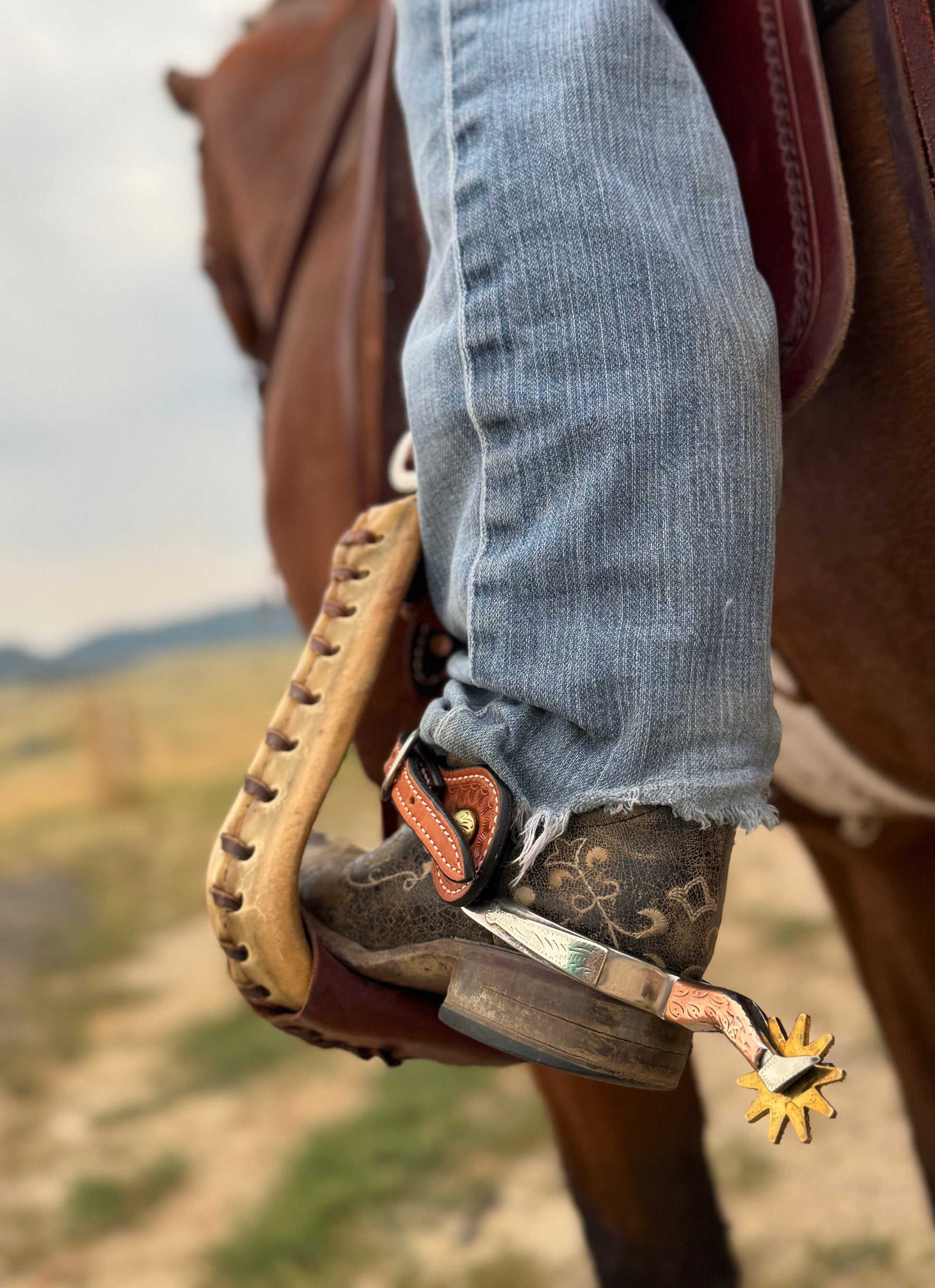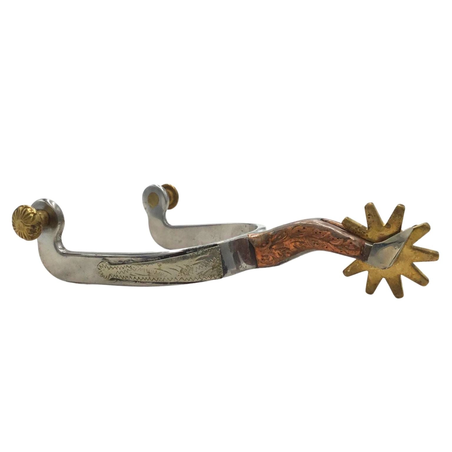 - A stainless steel spur with engraved nickel silver and brass overlay